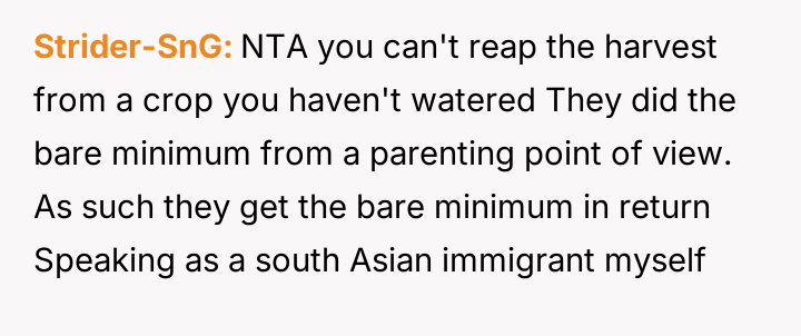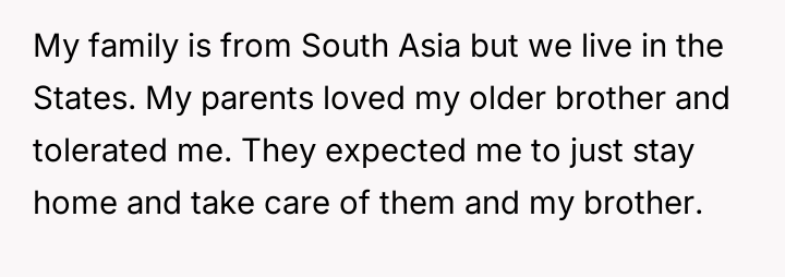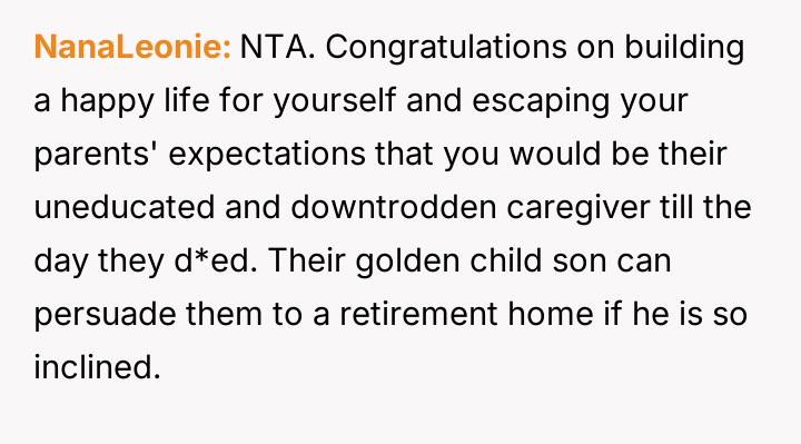 The original poster (OP) has clearly es**blished an independent life, prioritizing her own choices regarding career, marriage, and family planning, which directly conflicts with her parents' traditional expectations for her role as a daughter.