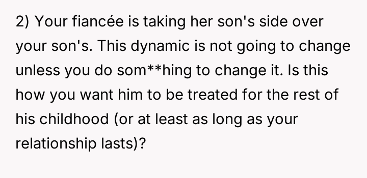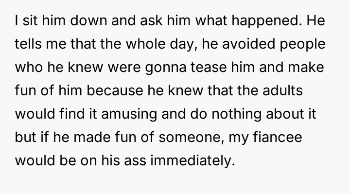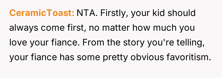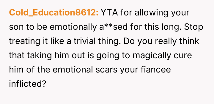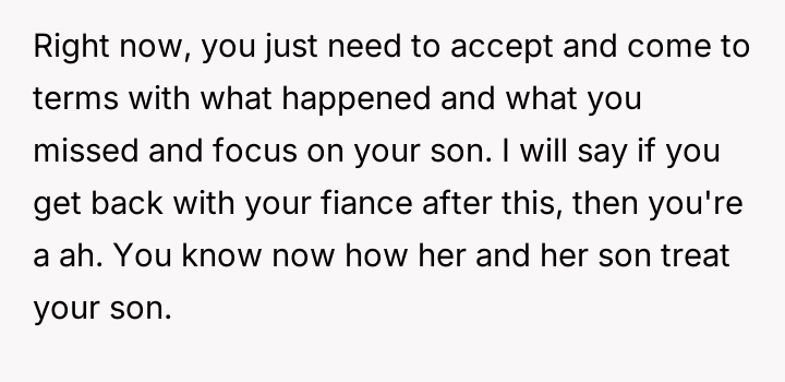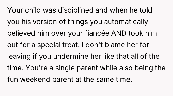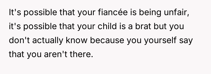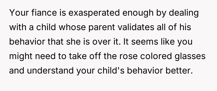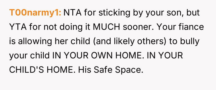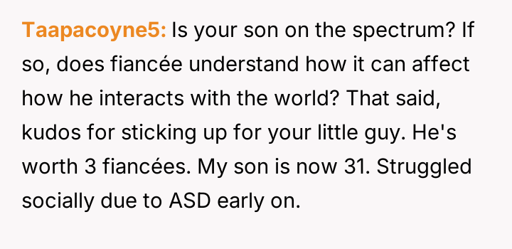 The original poster (OP) found himself in a direct conflict between supporting his son's emotional experience and meeting his fiancée's expectations for discipline and behavior management.