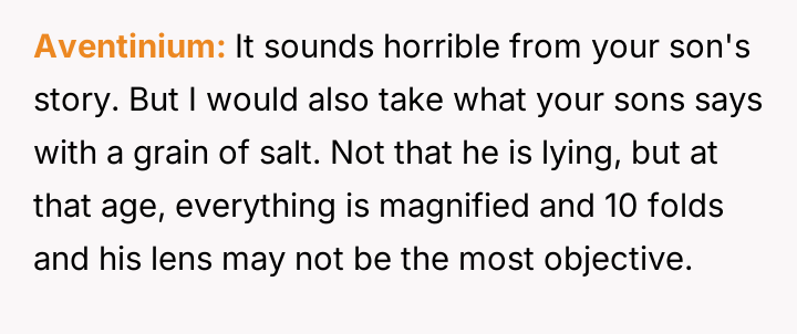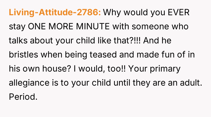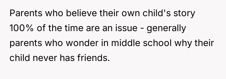 The core question remains whether prioritizing a child's immediate emotional validation and safety from perceived bullying, even at the cost of alienating a partner over disciplinary alignment, const*tutes the correct parental stance.