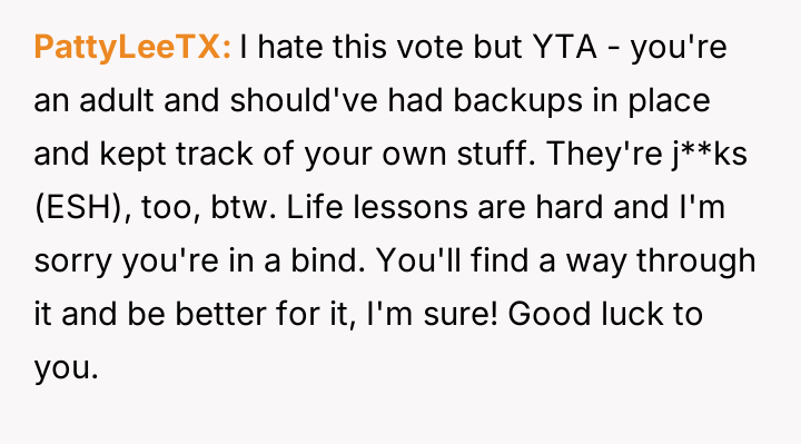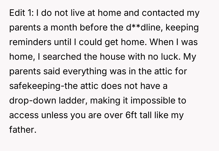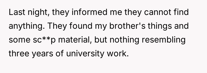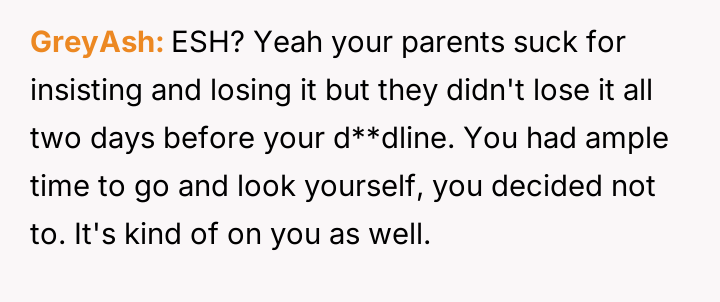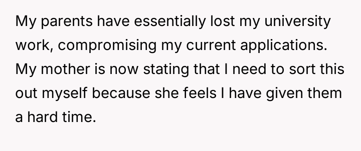 The original poster (OP) is facing a severe setback due to their parents losing crucial university materials necessary for a master's application.