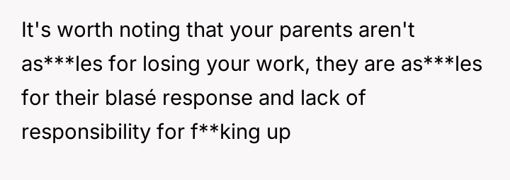 Given that the parents failed to secure irreplaceable physical academic materials despite being asked well in advance, should the OP prioritize demanding an apology and accountability, or is the immediate focus solely on mitigating the application damage, even if it means accepting the parents' dismissal of responsibility?