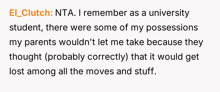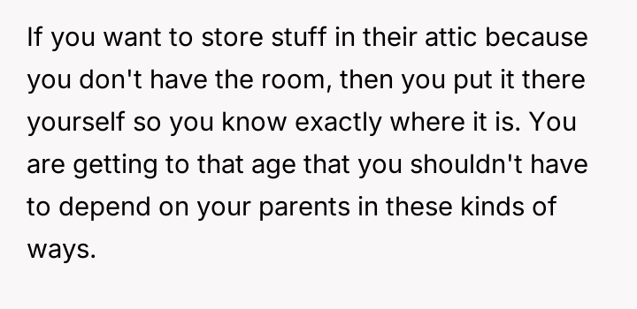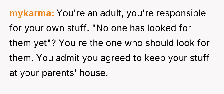 The central conflict is the OP's dependence on their parents for stored items versus the parents' failure to safeguard or locate these items, leading to heightened stress just before a d**dline.