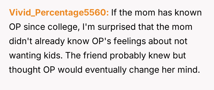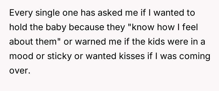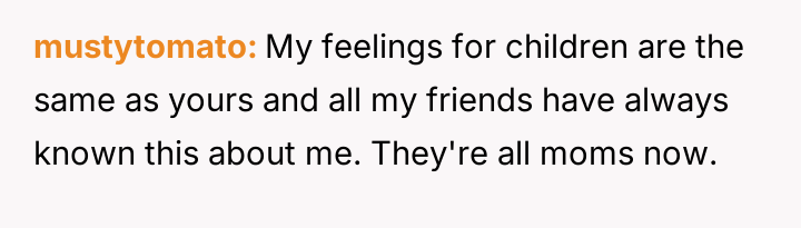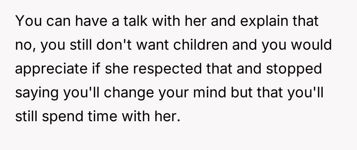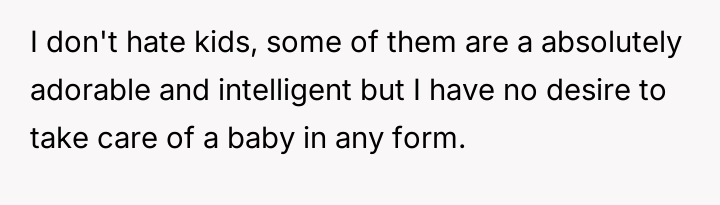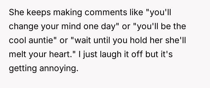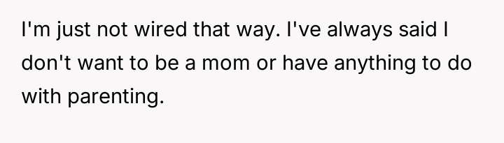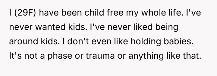 The original poster (OP) maintained a clear, long-standing stance of being child-free, which clashed directly with her friend Anna's high expectations for post-birth involvement.