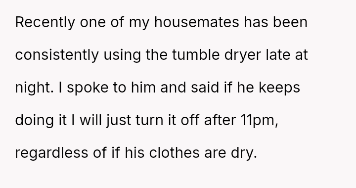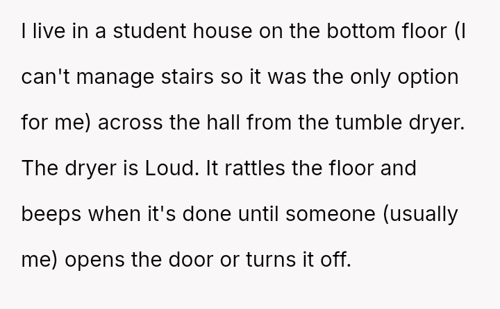 In a shared house filled with promise of understanding, she sought only a simple kindness: no dryer noise after 11pm.