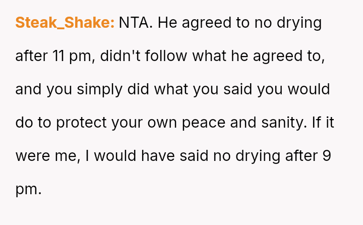 Did the OP act appropriately by enforcing the previously agreed-upon quiet hours rule by turning off the dryer, or should they have managed the situation differently given the housemate's one-time late-night need?