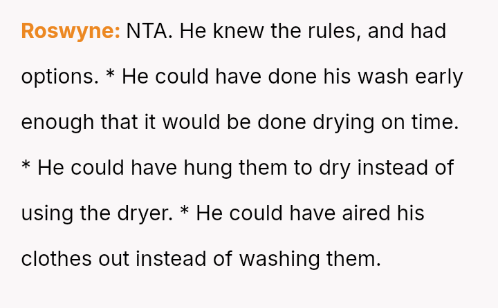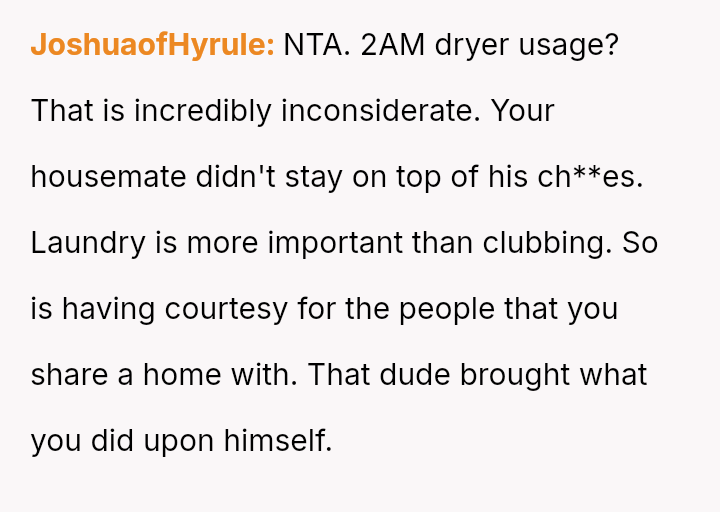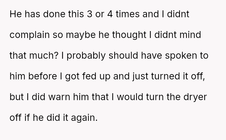 The central tension arises from the OP enforcing a previously es**blished boundary by turning off the dryer, which resulted in negative consequences (damp clothes) for the housemate, leading to a demand for an apology.