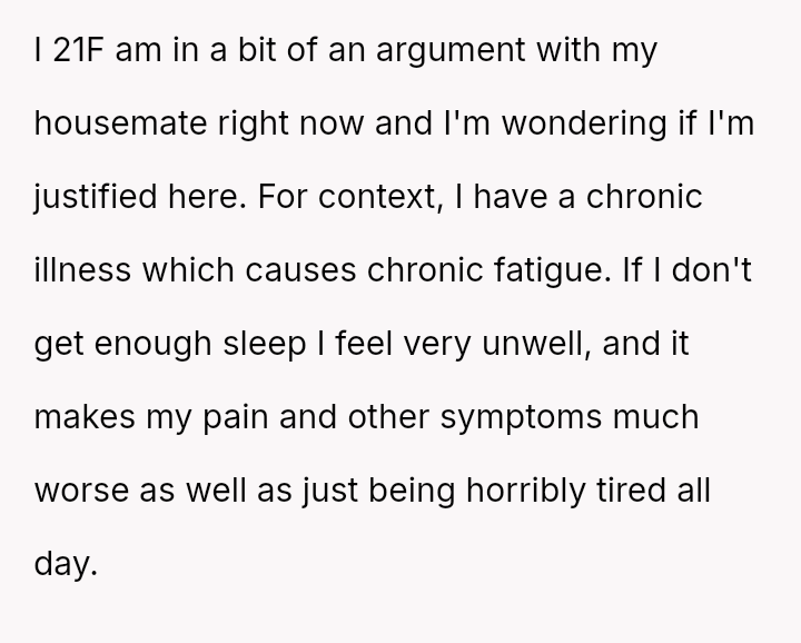 The original poster (OP) is experiencing a direct conflict between managing a significant chronic illness that requires strict sleep hygiene and a housemate's routine use of a loud appliance outside of their agreed-upon time limit.