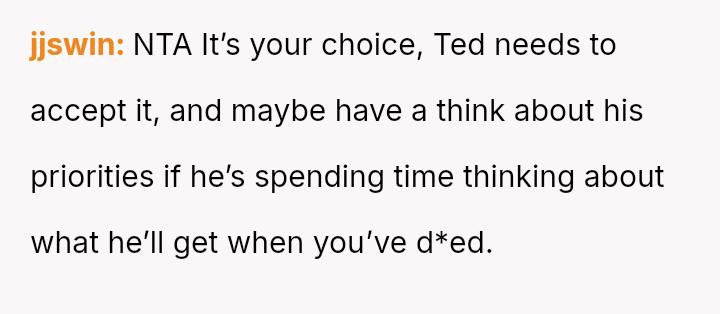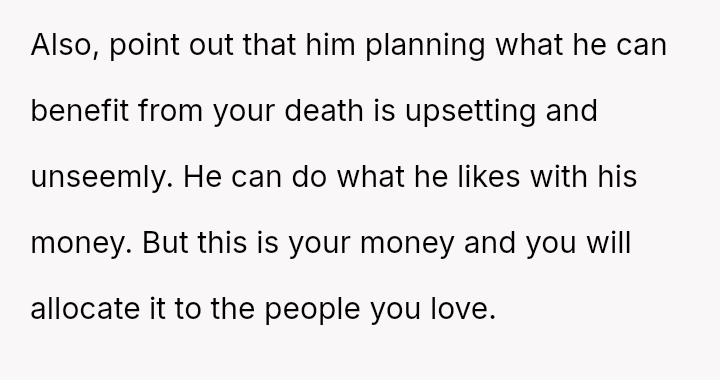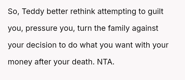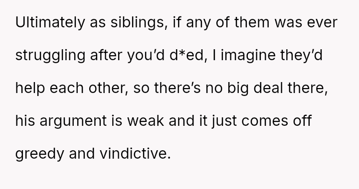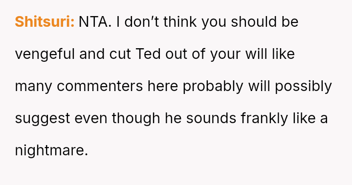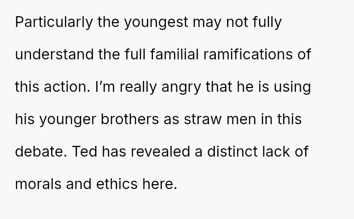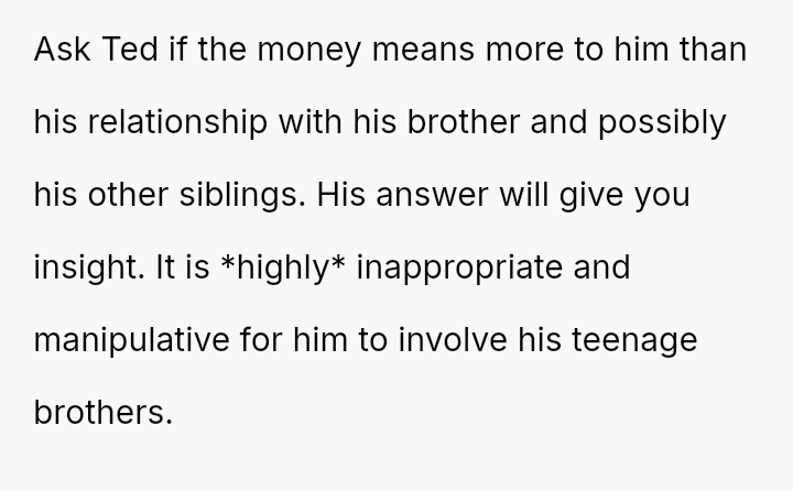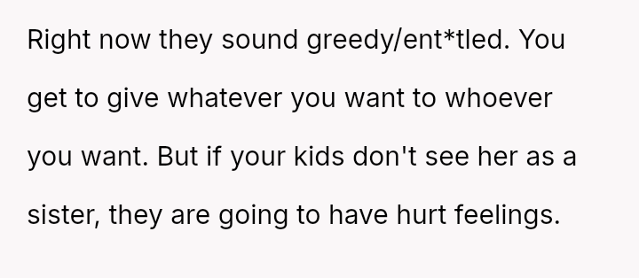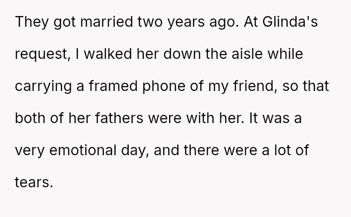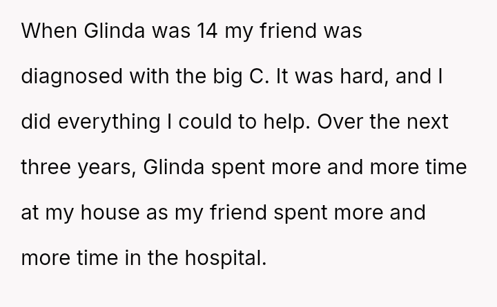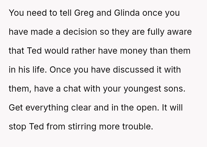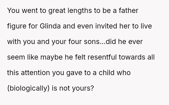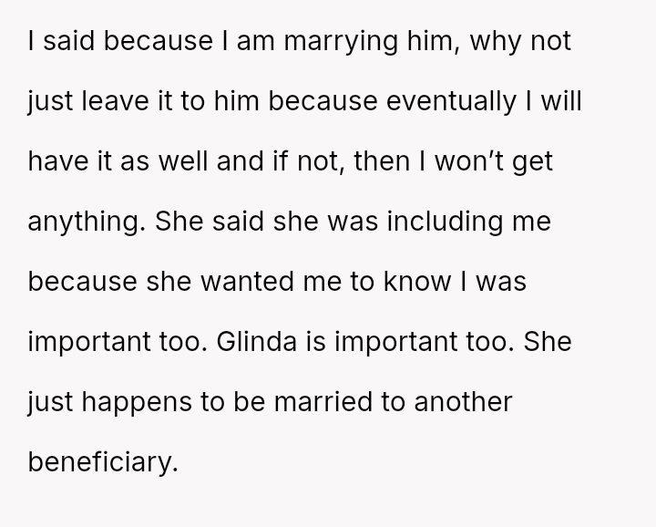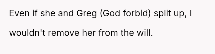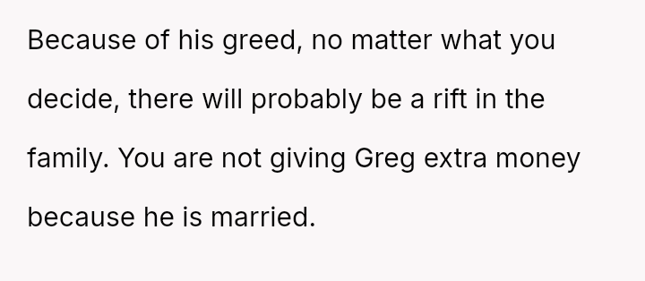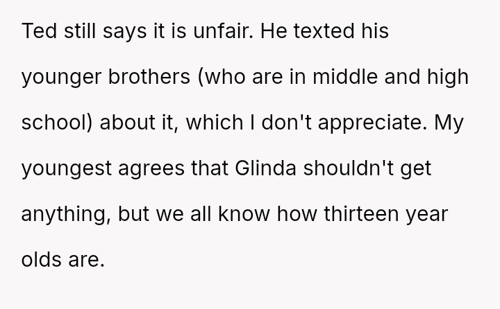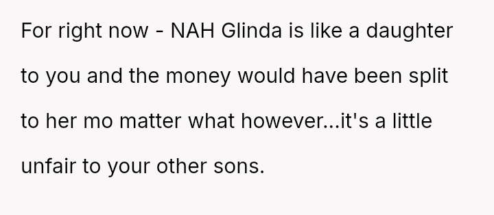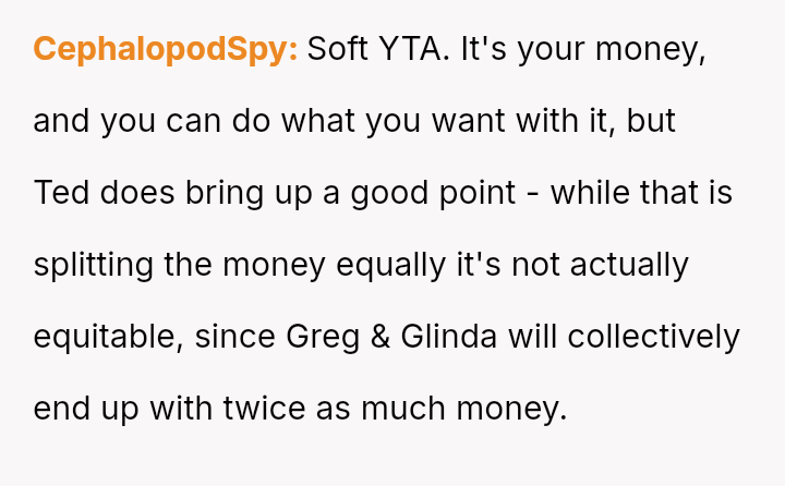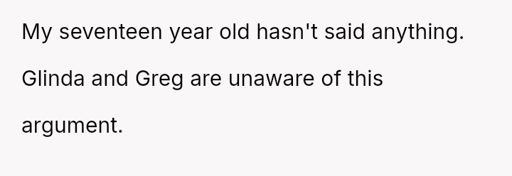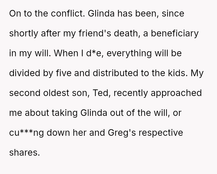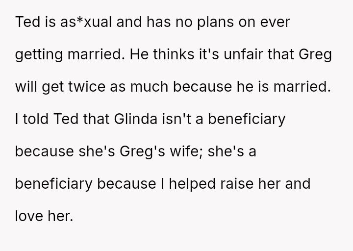 The central conflict arises from their son Ted's belief that this arrangement const*tutes unfair "double-dipping" because Greg is married to Glinda, while the OP views the inclusion as a fulfillment of their long-standing paternal commitment to Glinda.