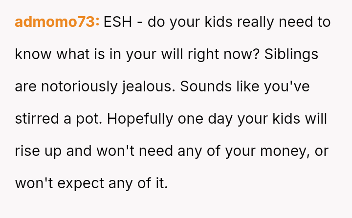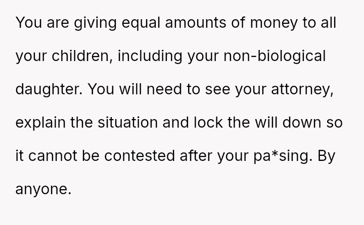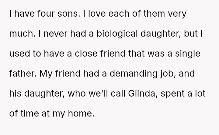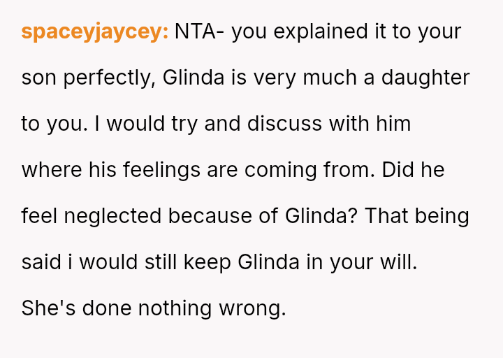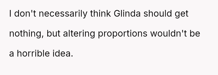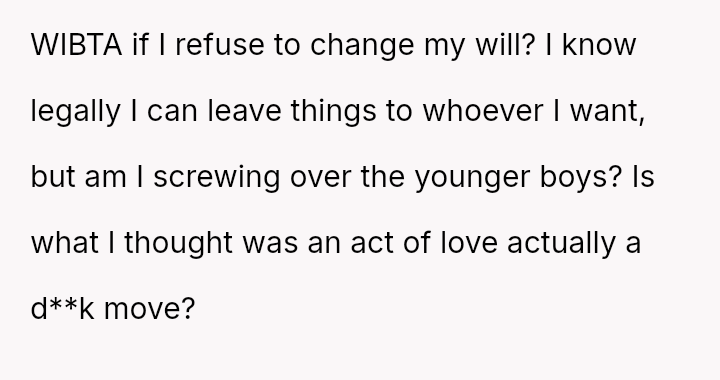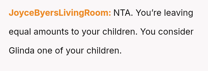 The original poster (OP) is facing a significant conflict regarding their will, where they have included their adopted daughter figure, Glinda, as an equal beneficiary alongside their four biological sons.