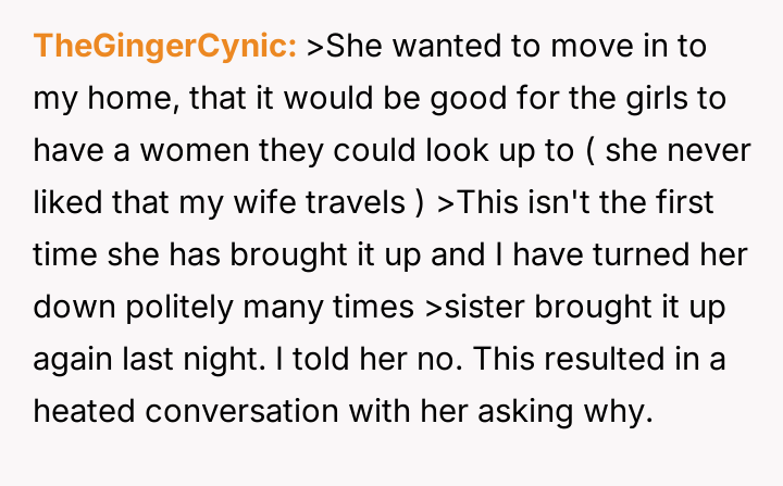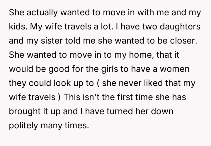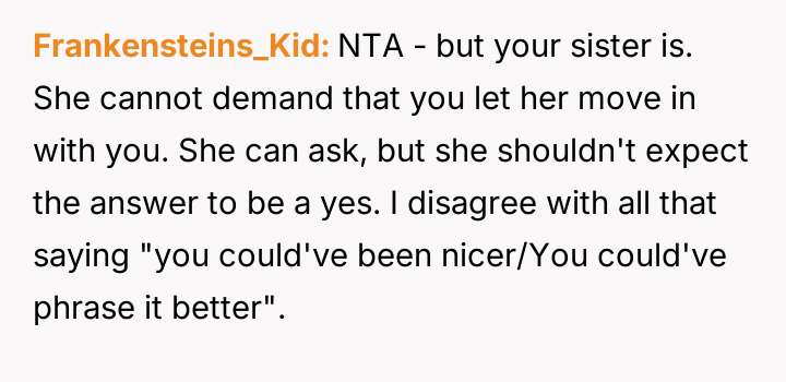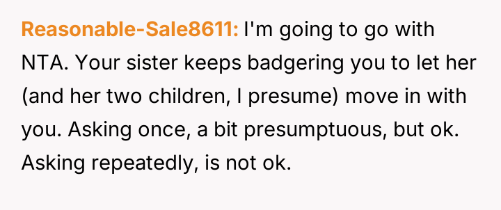 The original poster (OP) feels justified in protecting his family environment and setting clear boundaries against his sister's request to move in, especially given his concerns about her lifestyle choices as a role model.
