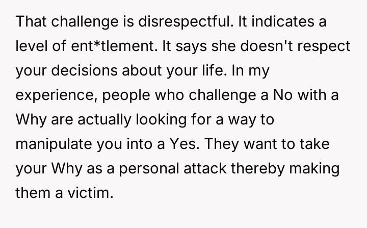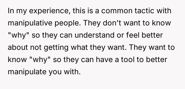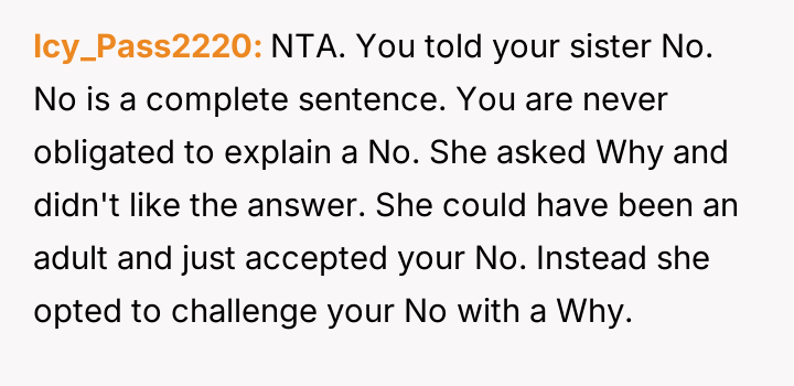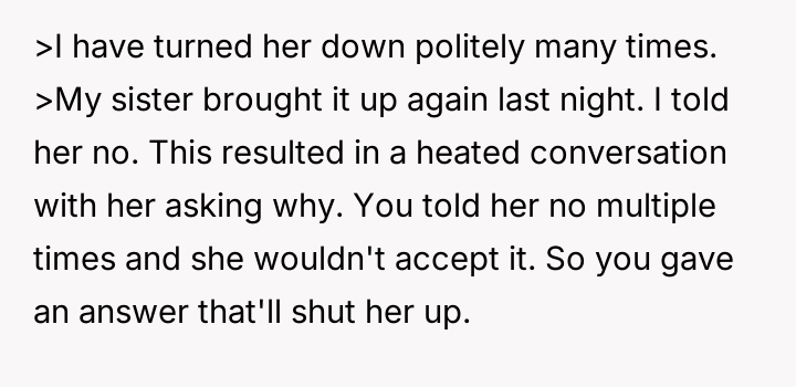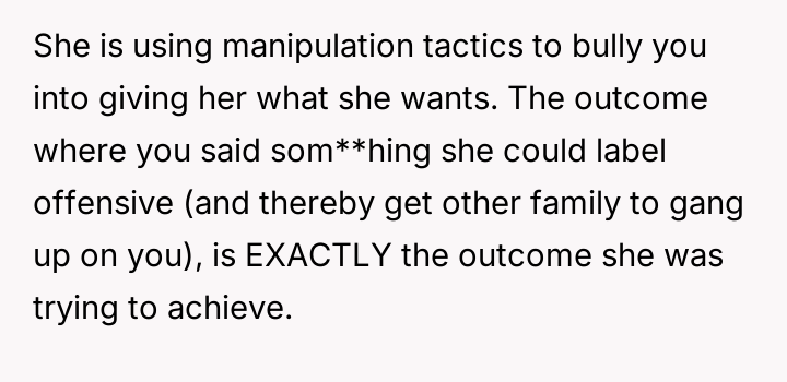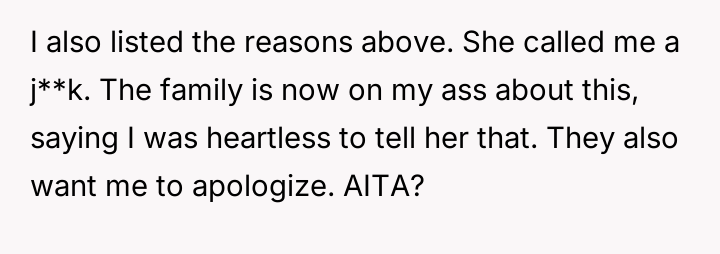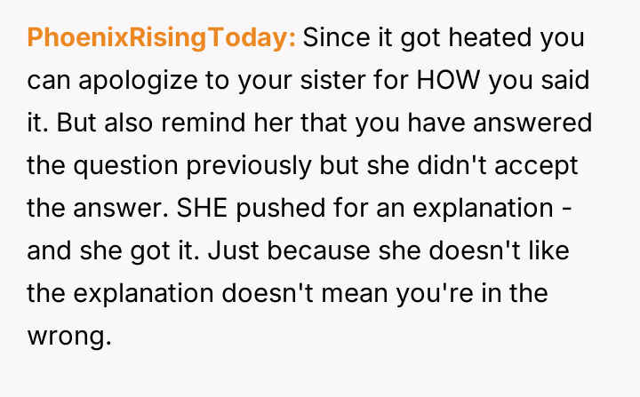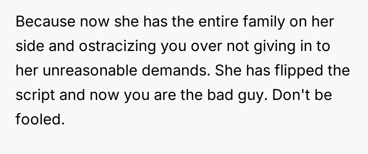However, this honesty has led to significant conflict with his sister and pressure from extended family who view his refusal as overly harsh and unsupportive.
