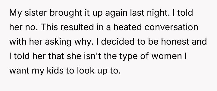 AITA for telling my sister she isn’t the type of person I want my daughters to look up to