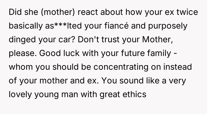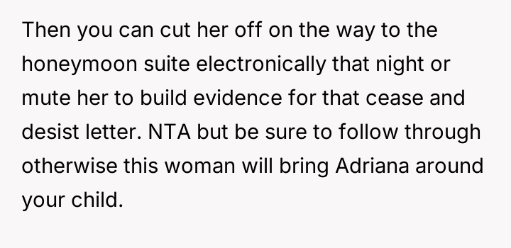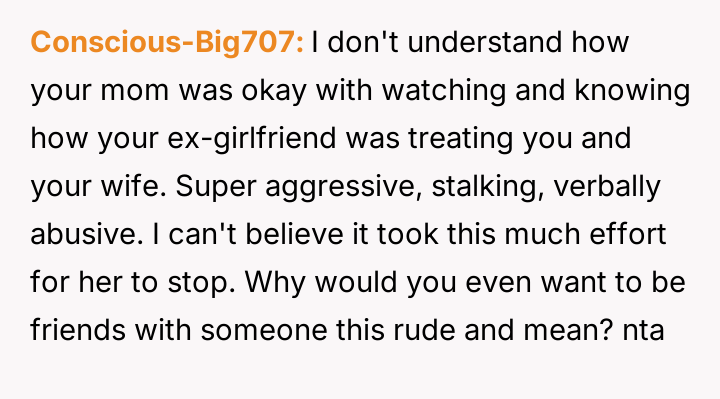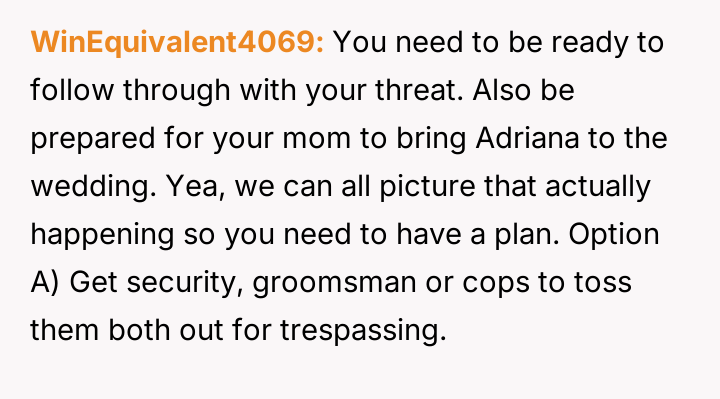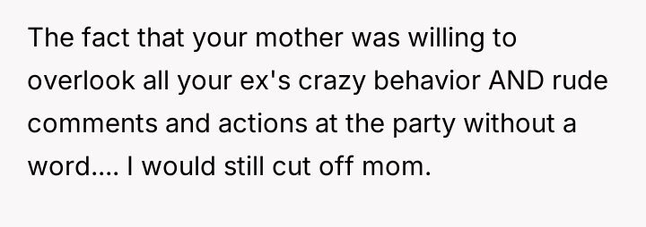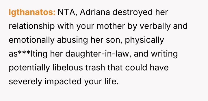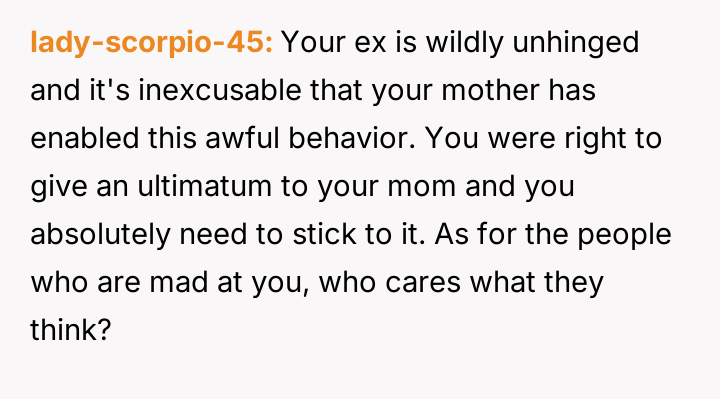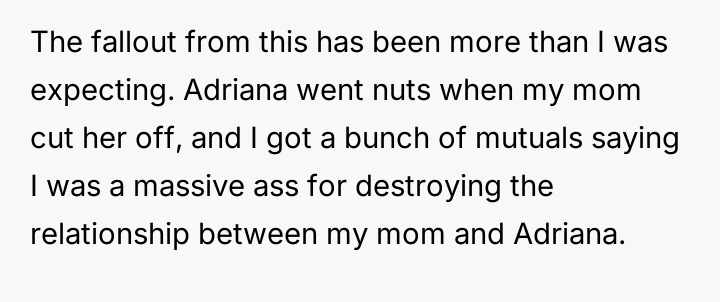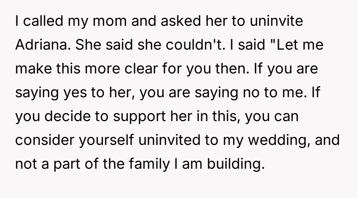 Given the escalating h***ssment from the ex, including physical actions at a family event, was the OP's ultimatum to his mother—threatening to exclude her from his wedding and future grandchildren if she maintained contact with Adriana—a necessary defense of his boundaries or an overly harsh demand that fractured his existing family ties?
