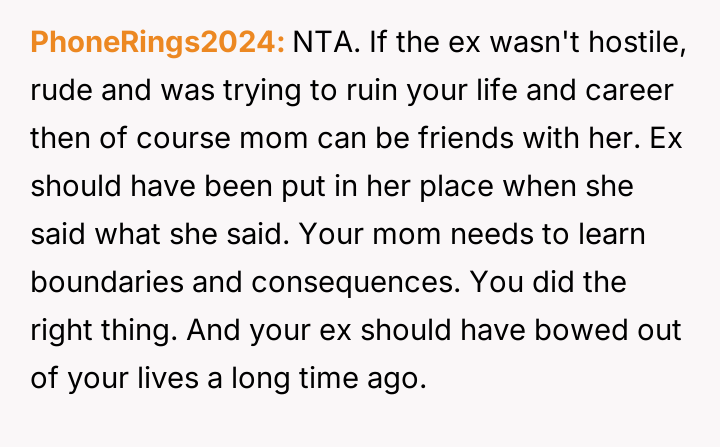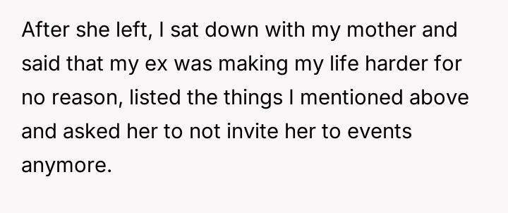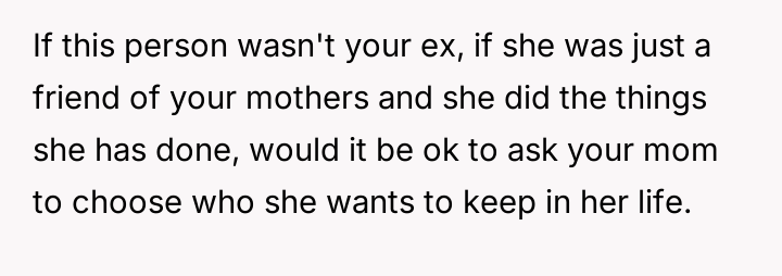 The central conflict arises from the OP prioritizing his immediate family's peace over his mother's es**blished friendship with the ex, leading to an ultimatum that strained the mother-son relationship.