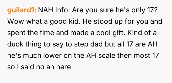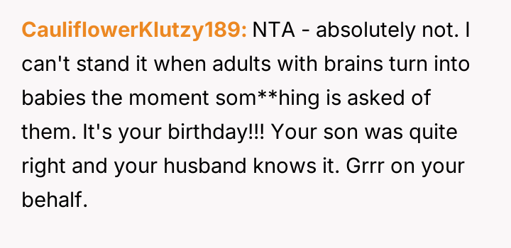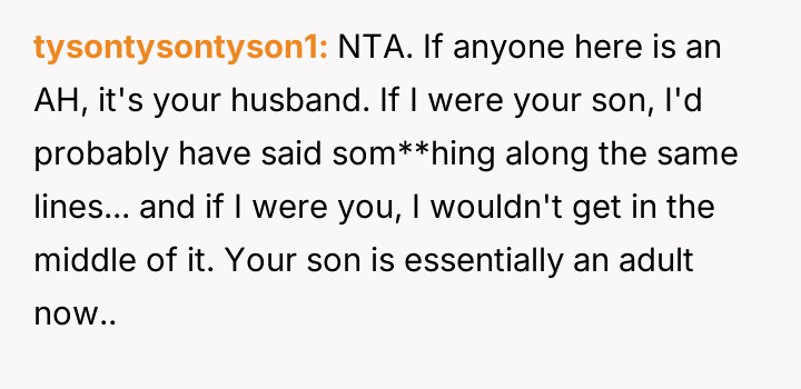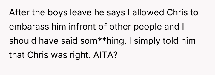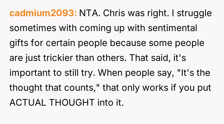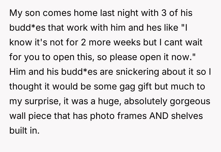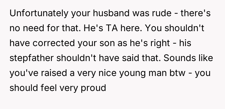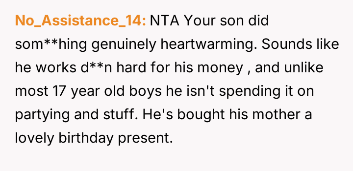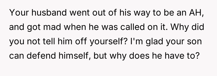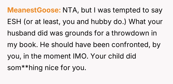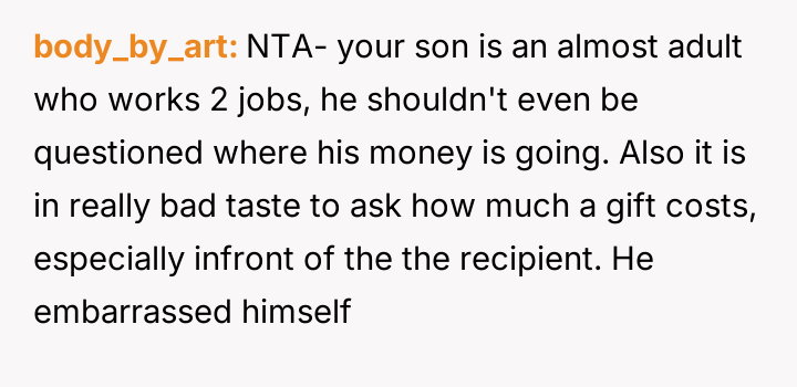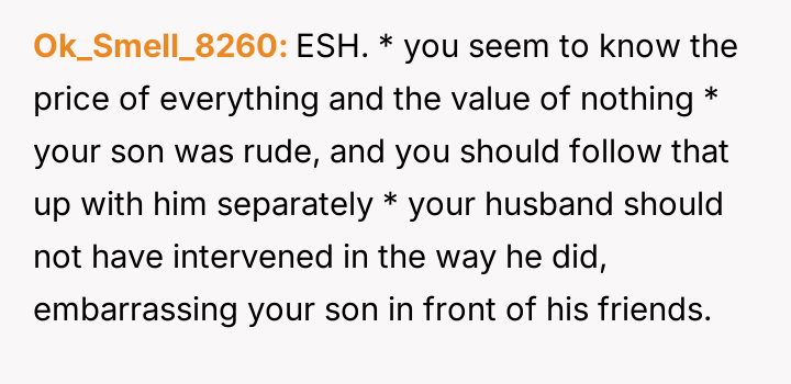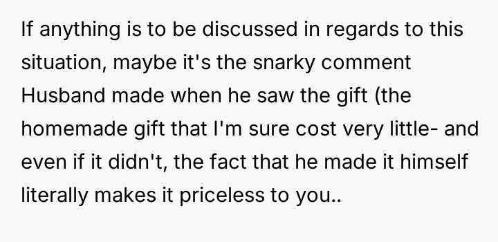 While the OP values the sentimental gift and supports her son's actions, her husband feels publicly embarrassed and criticized by the exchange, placing the OP in a difficult position regarding her loyalty and her husband's emotional needs.