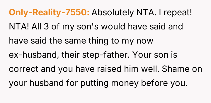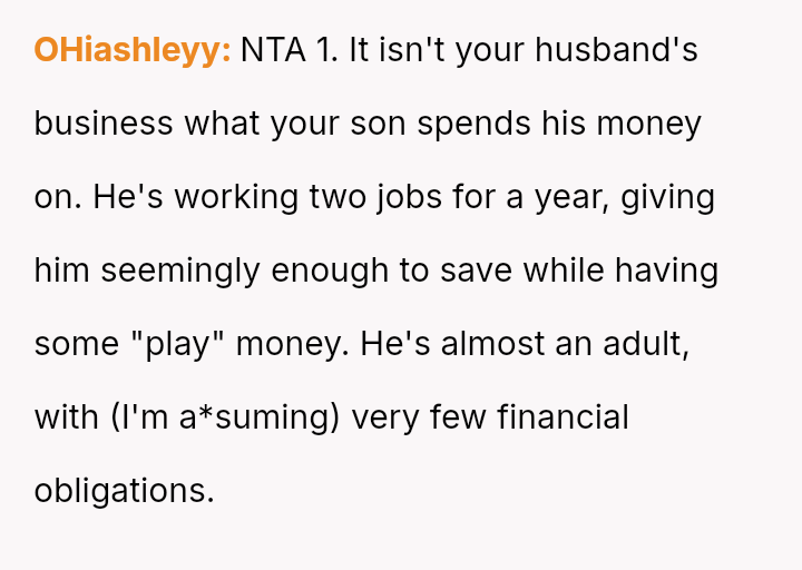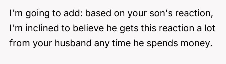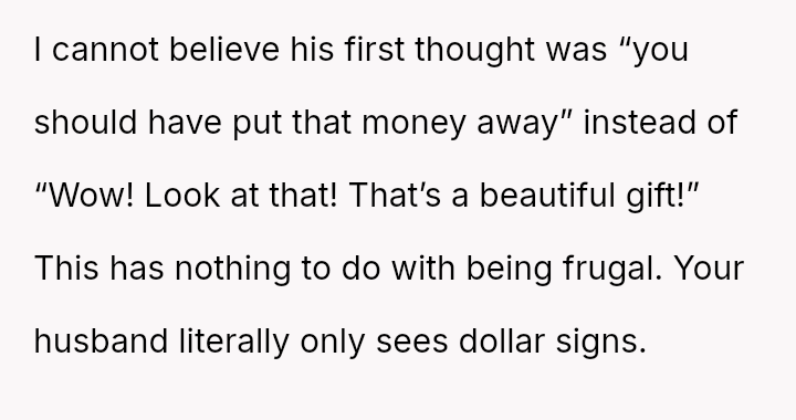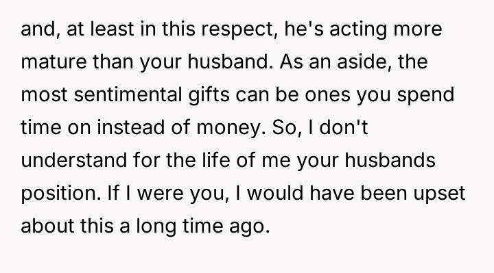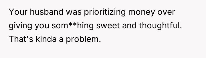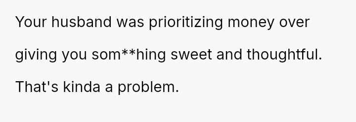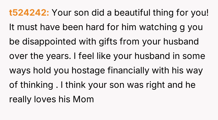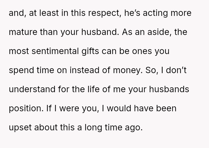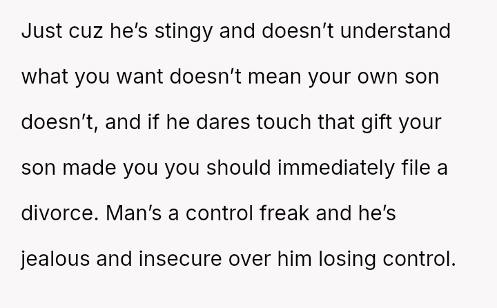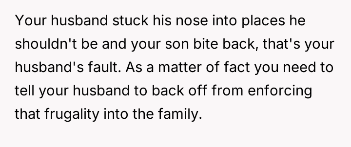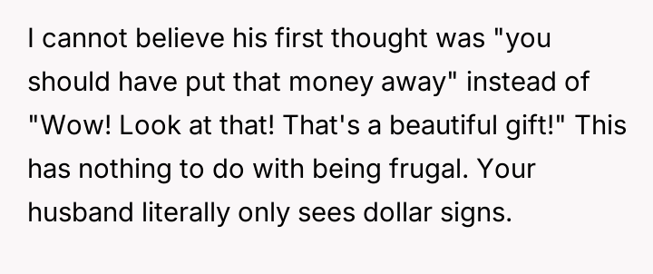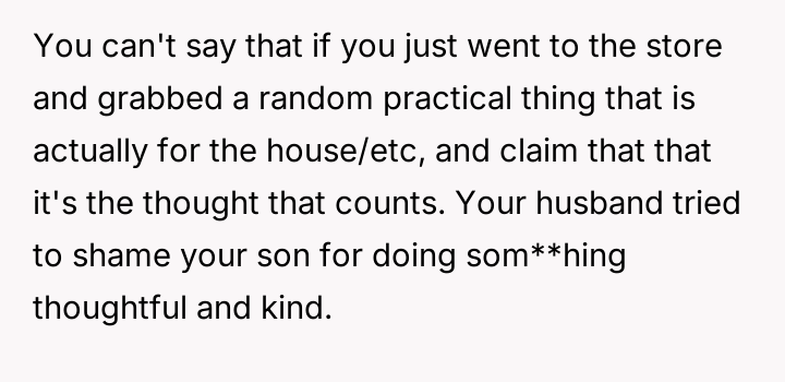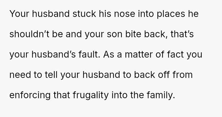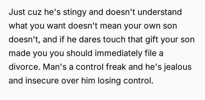The original poster (OP) is caught between her husband's extreme frugality and her son's deeply sentimental gesture intended to compensate for the husband's lack of thoughtful gift-giving.