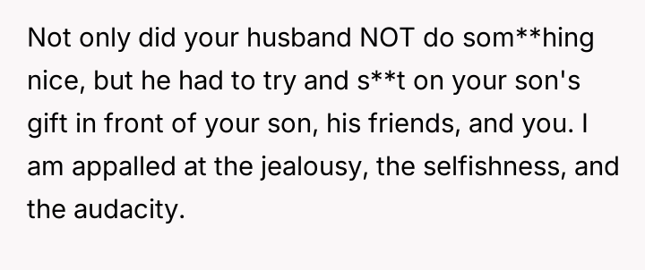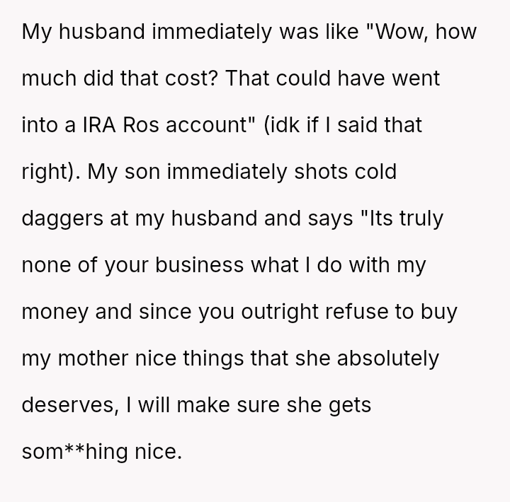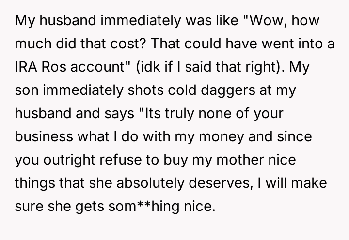Given the husband's strong reaction to perceived public humiliation versus the son's successful attempt to provide sentimental value, the core question remains: Is it justifiable for an adult child to actively challenge a parent's financial habits in order to provide a sentimental gift the other parent has repeatedly failed to give, especially when that gift is well-received by the recipient?