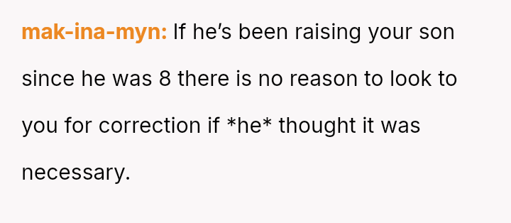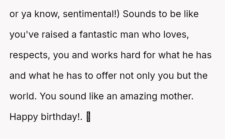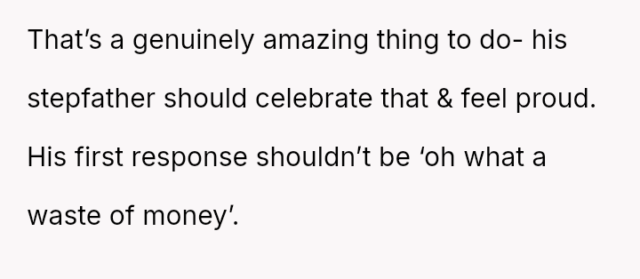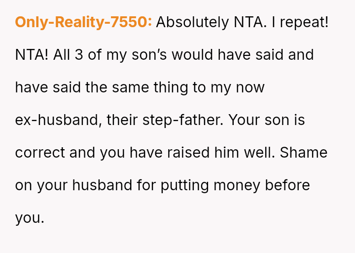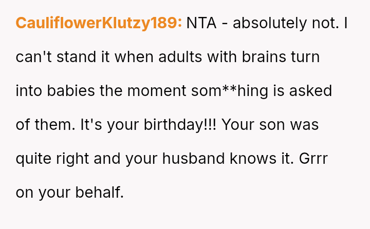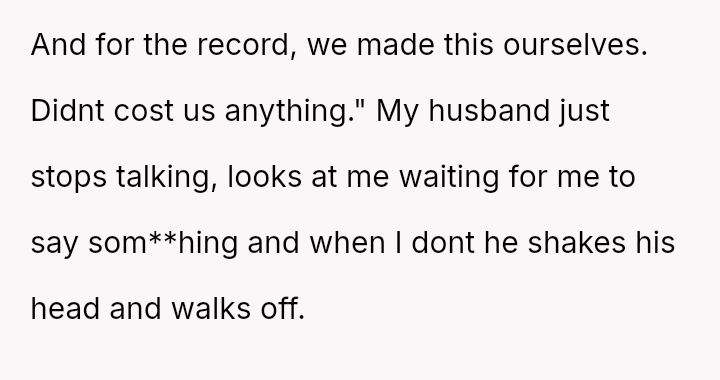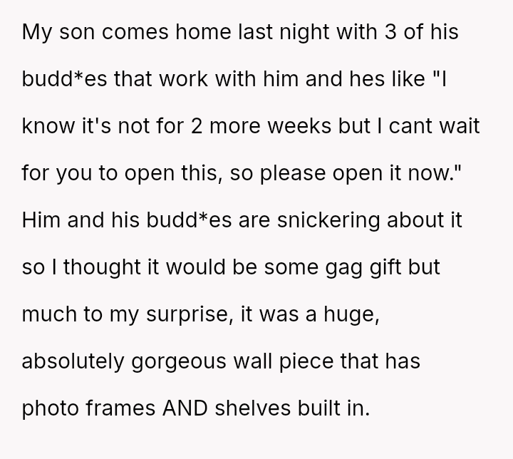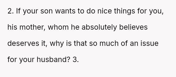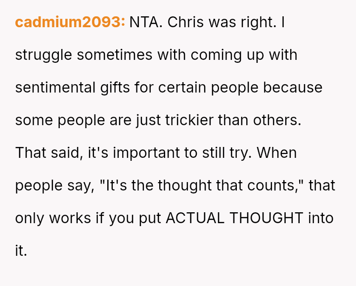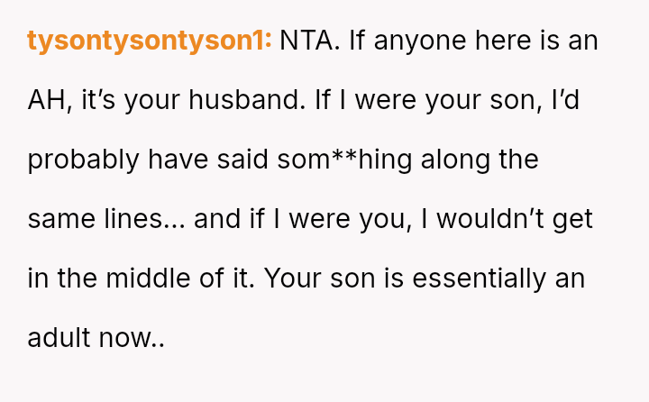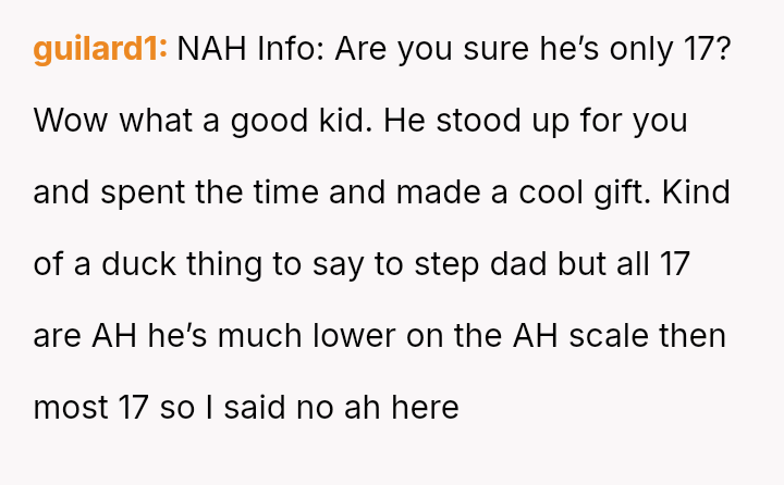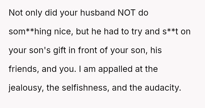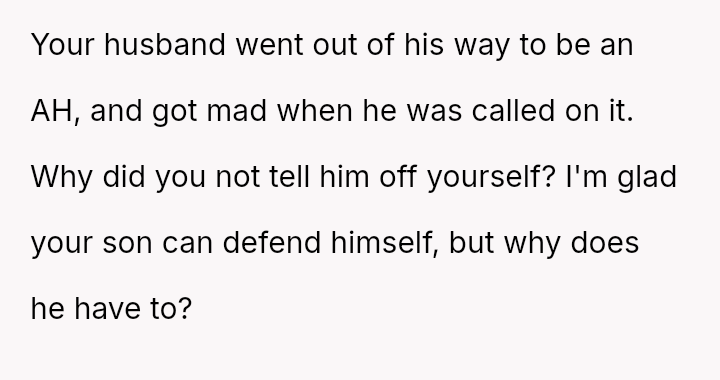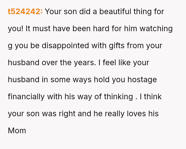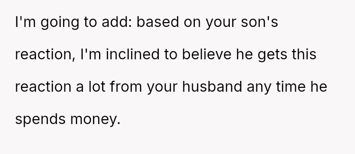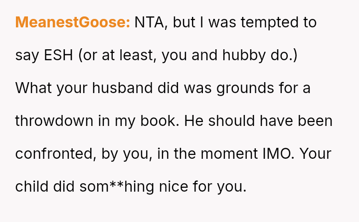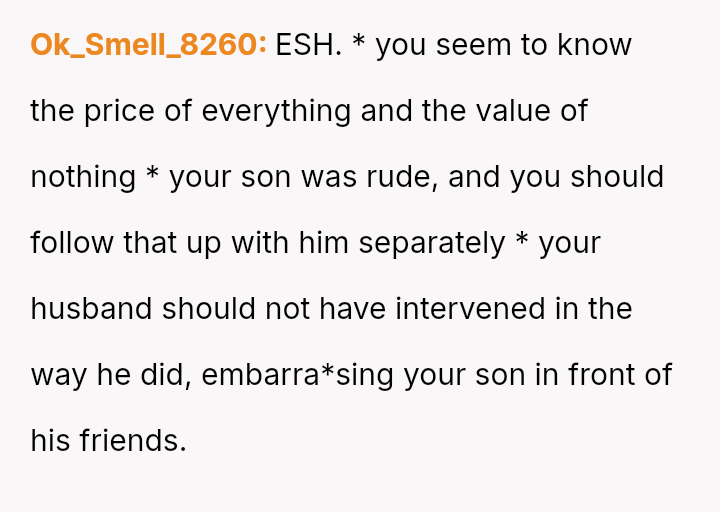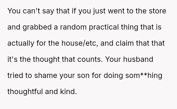While the OP values the sentimental gift and supports her son's actions, her husband feels publicly embarra*sed and criticized by the exchange, placing the OP in a difficult position regarding her loyalty and her husband's emotional needs.