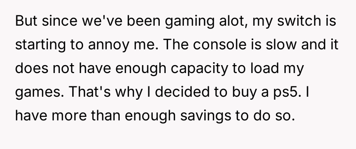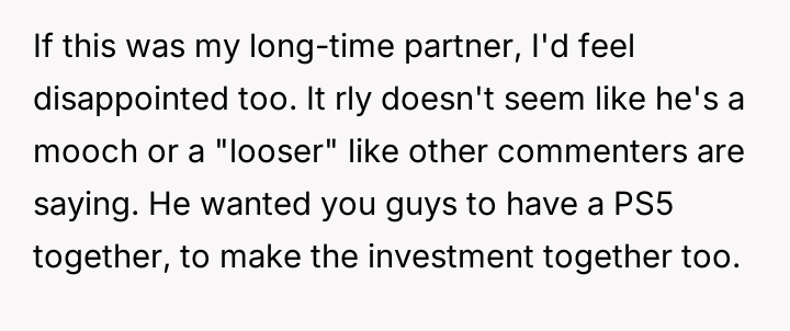 Her decision to buy the PlayStation 5 alone, using her own savings, led to her boyfriend feeling betrayed because he viewed the purchase as a shared asset they were working towards.