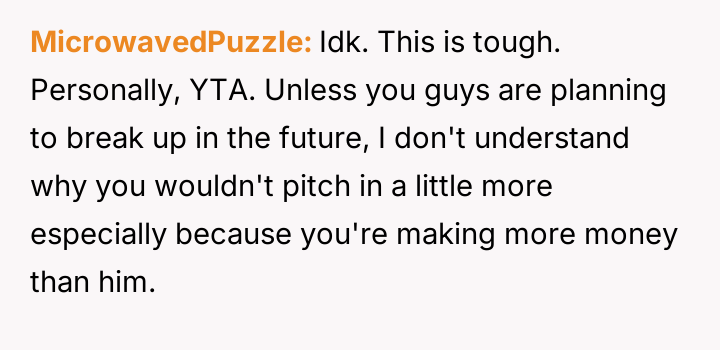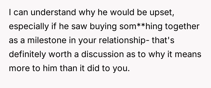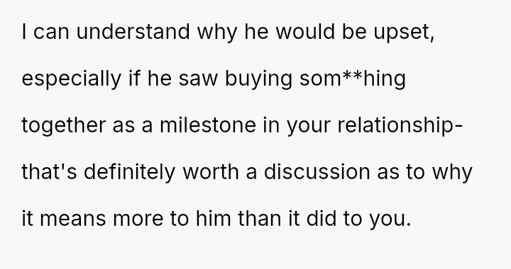 The core debate centers on whether the OP was justified in making a unilateral purchase of a desired shared item when a joint plan was in place, or if her boyfriend's emotional reaction is valid given the implied agreement and the financial history between them.
