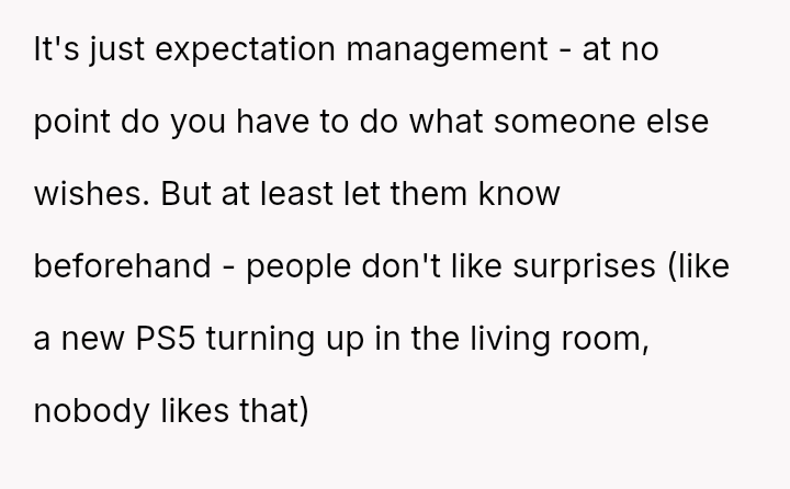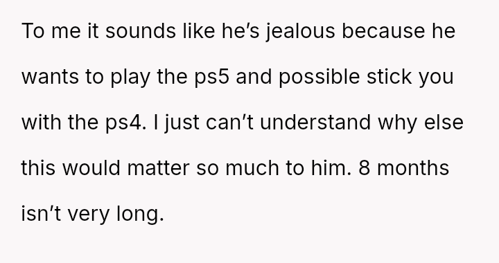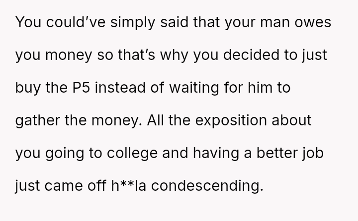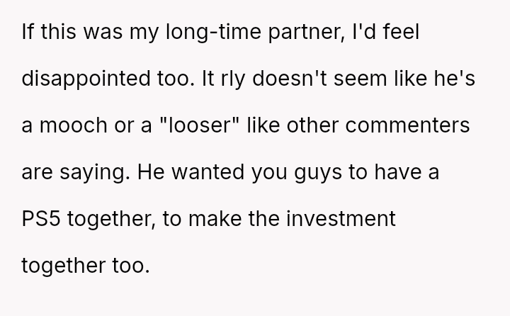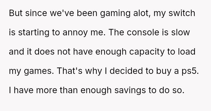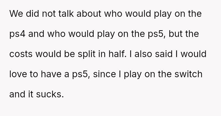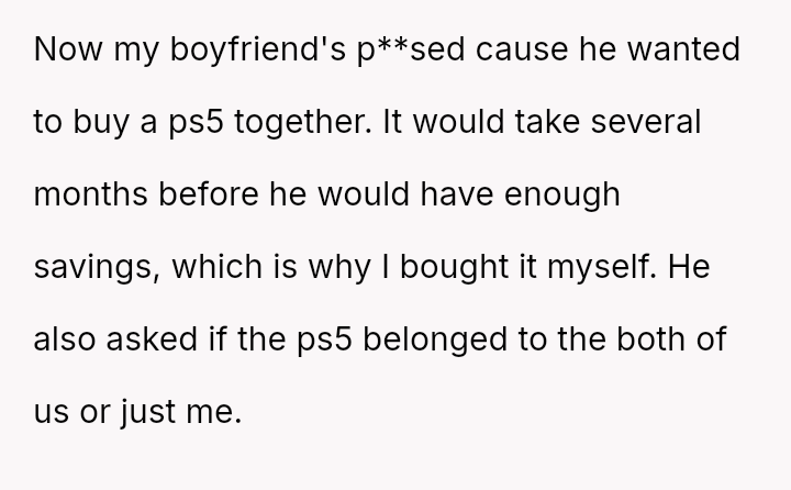 Her decision to buy the PlayStation 5 alone, using her own savings, led to her boyfriend feeling betrayed because he viewed the purchase as a shared a*set they were working towards.