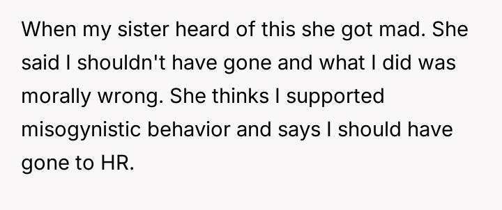 The sister believes attending supported misogynistic behavior and that reporting the situation to HR was the correct ethical response, placing her moral values in direct opposition to the OP's pragmatic career advancement strategy.