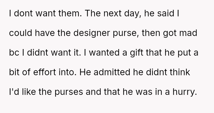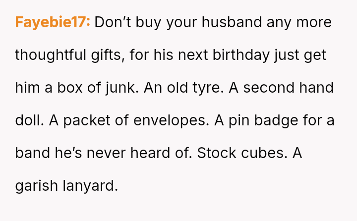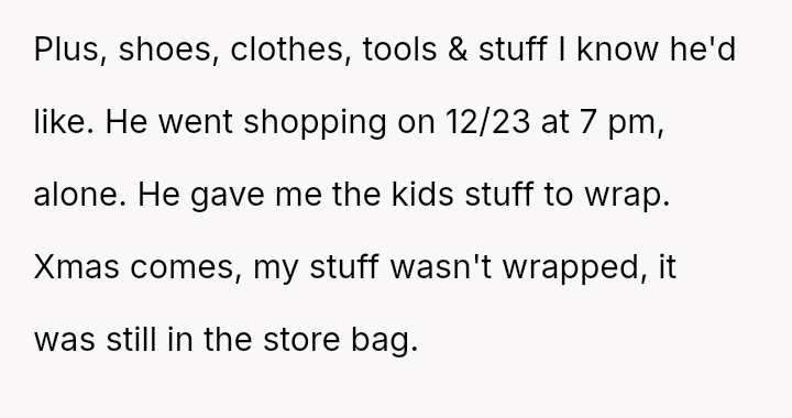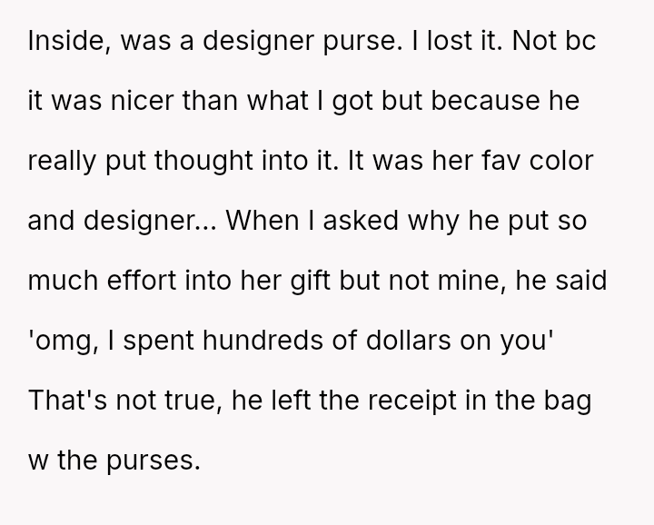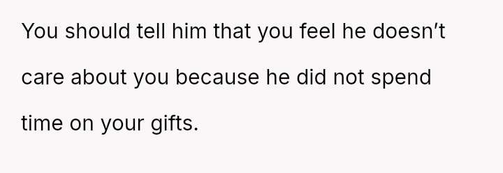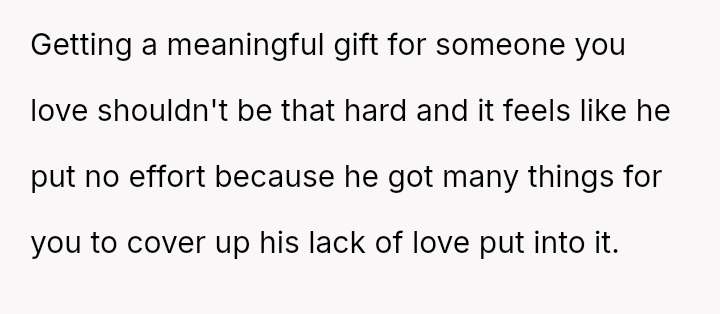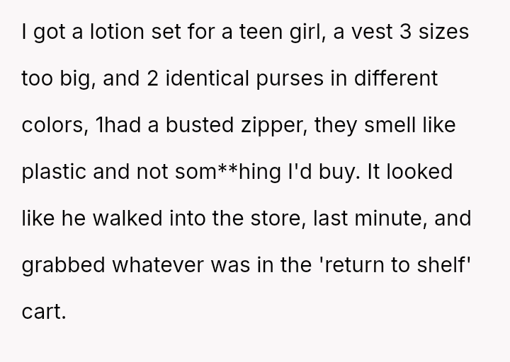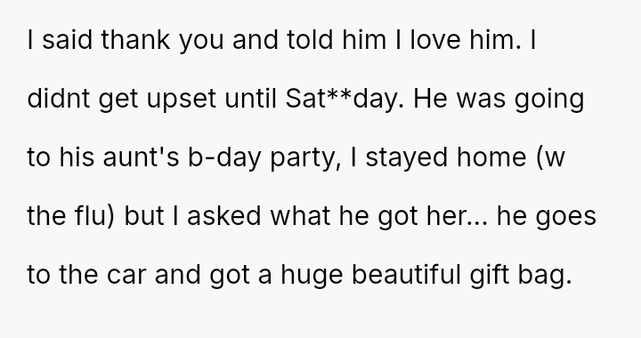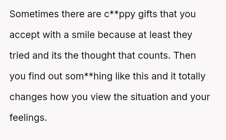 Yet, when she unwrapped his offerings, she was met with thoughtlessness—items that felt discarded, mismatched, and lacking the care she had shown.
