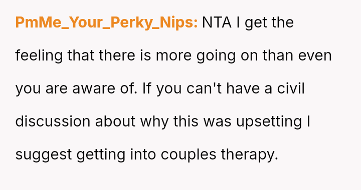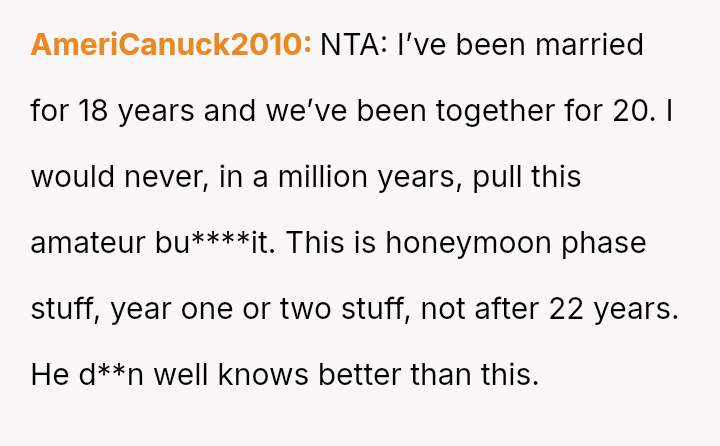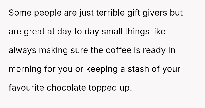 Her central conflict lies between her stated desire for thoughtful gestures and her husband's defense that the monetary value of his gifts should have sufficed, leading her to feel undervalued after 22 years together.