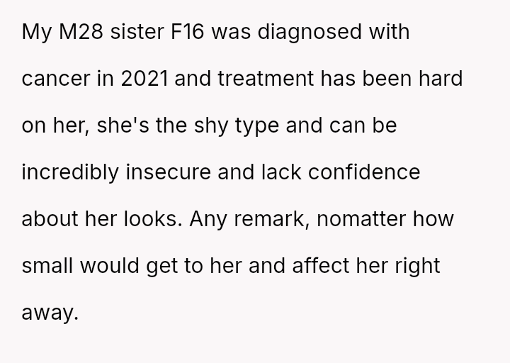 The Original Poster (OP) is clearly prioritizing the emotional well-being of his severely ill and insecure sister over his wife's feelings about how she was addressed.