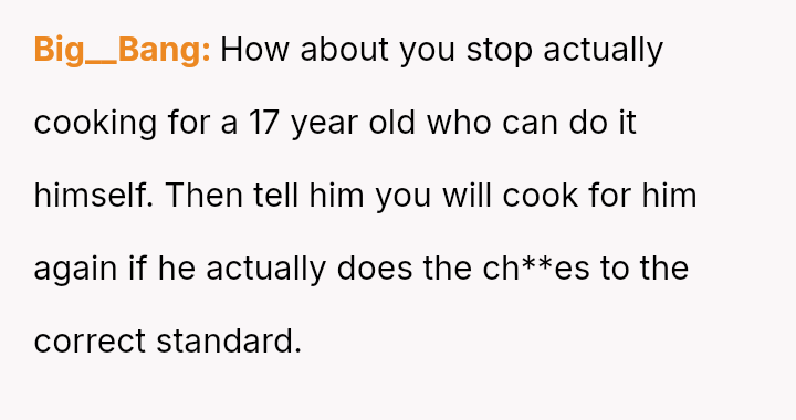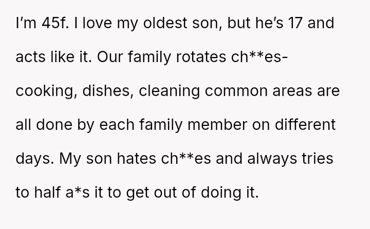 The original poster (OP) felt exhausted and frustrated by her 17-year-old son's repeated refusal to complete his ch**es correctly, leading to necessary extra work for others.