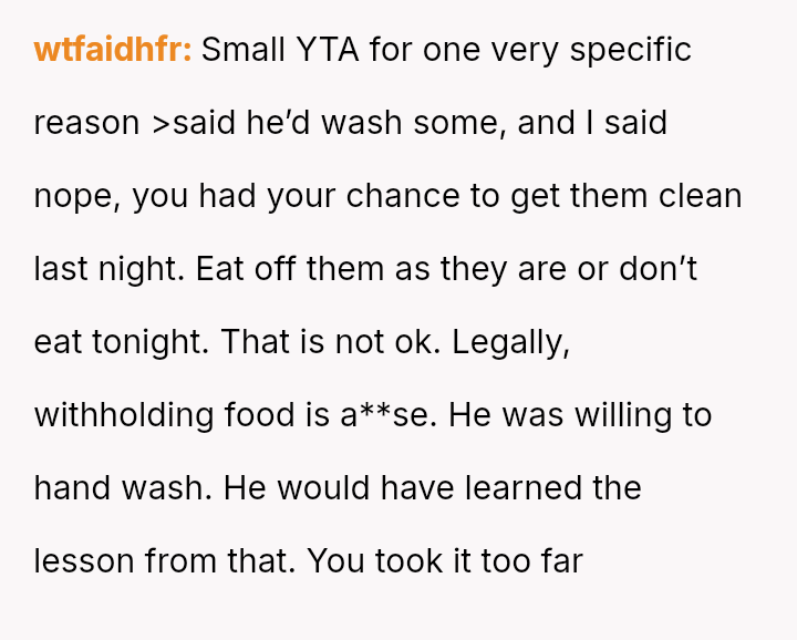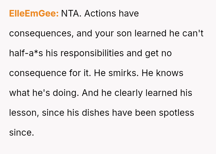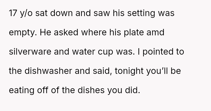 Was the mother justified in making her son eat off the dirty dishes he failed to clean properly as a lesson in accountability, or did this m**hod of punishment cross a line into being overly harsh and humiliating for a teenager?