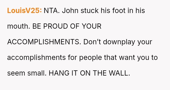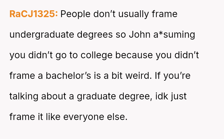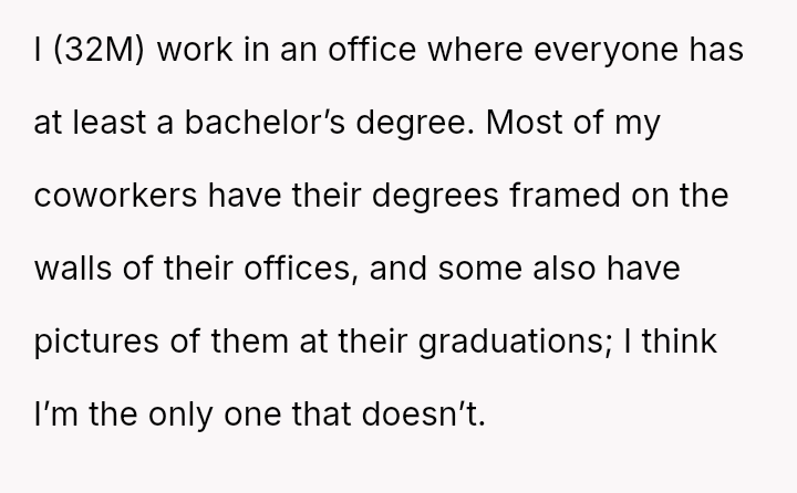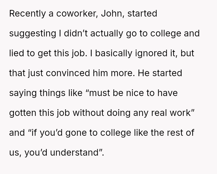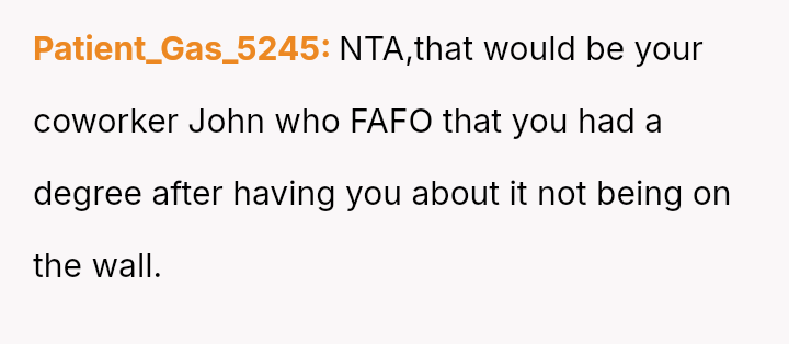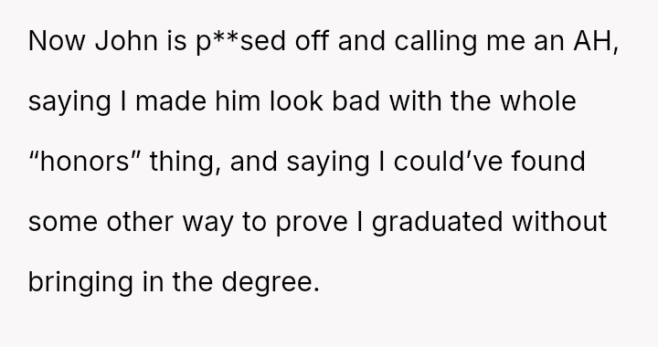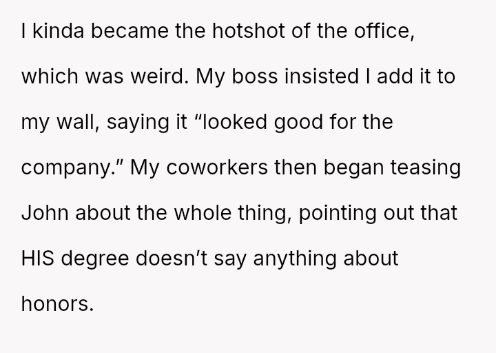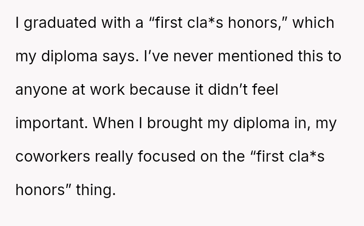 The original poster (OP) felt pressured by his coworkers' display culture and John's unfounded accusations to prove his educational background, which led him to reveal an achievement (First Cla*s Honors) he usually kept private.