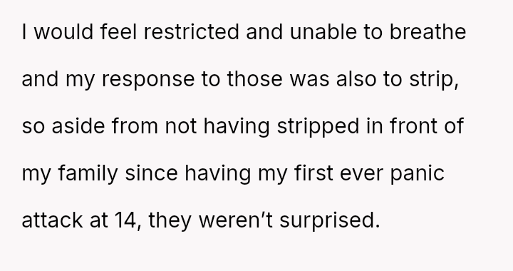 The original poster experienced physical discomfort leading to an action (removing a shirt) that caused them immediate personal shame.