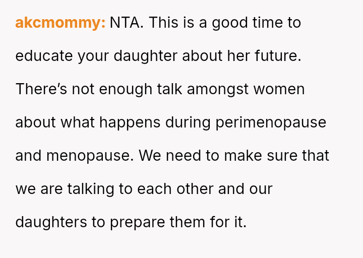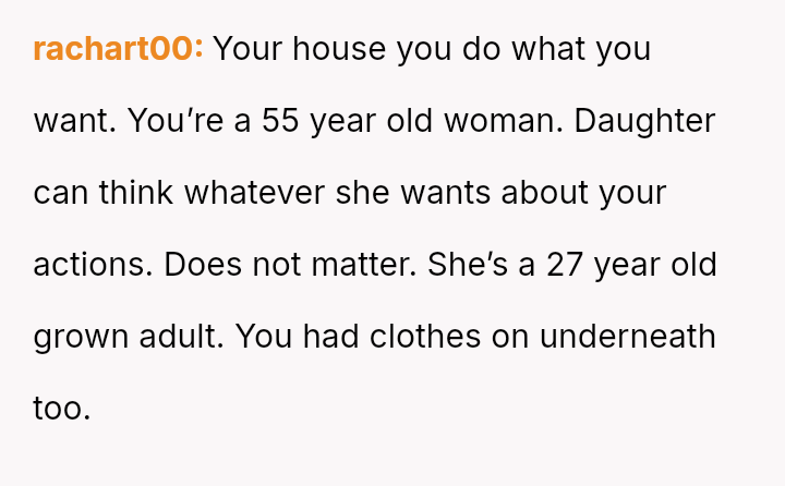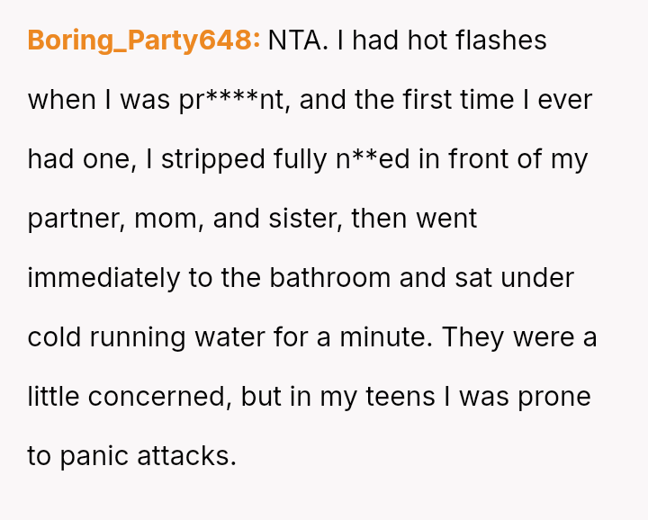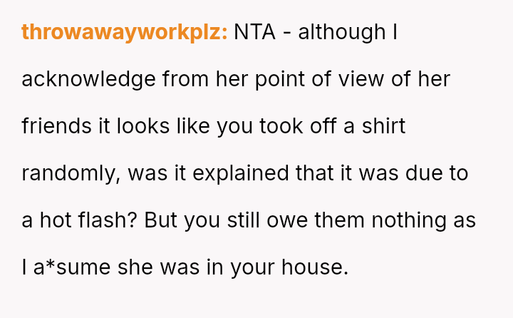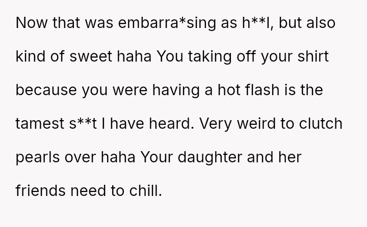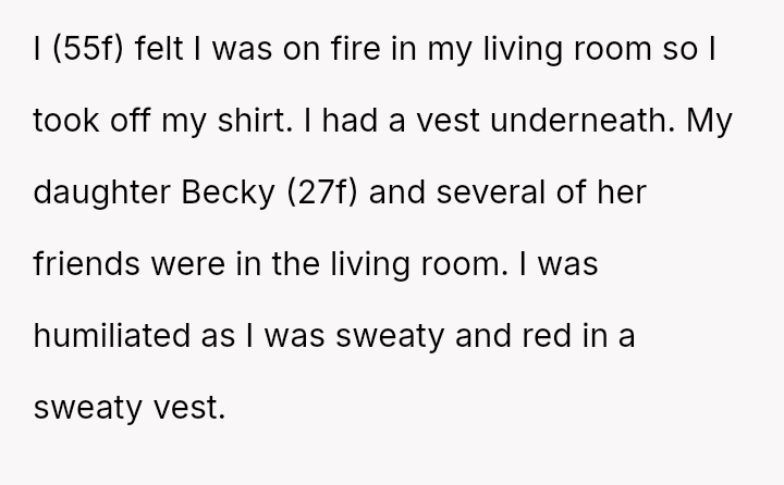 Was the OP justified in prioritizing their immediate physical need over maintaining a specific public image in front of their daughter's friends, or should the OP have left the room to manage their discomfort privately?
