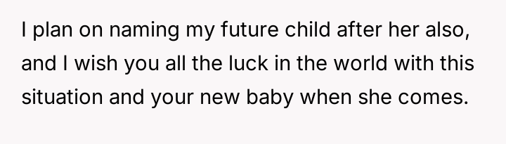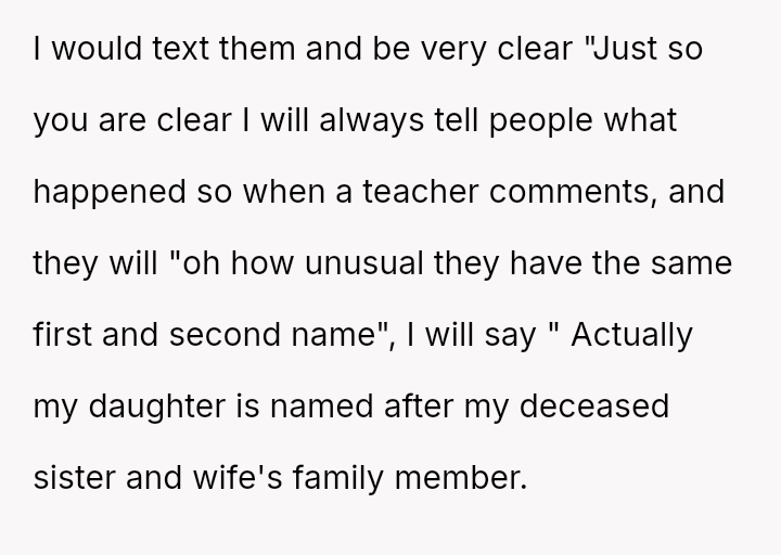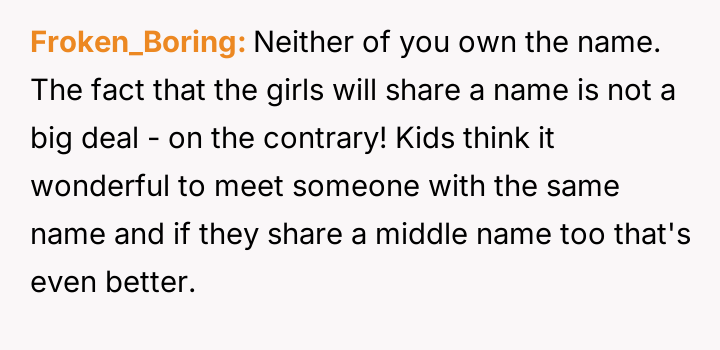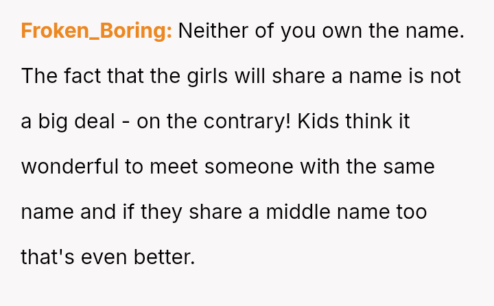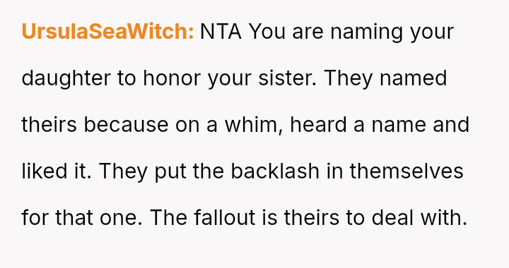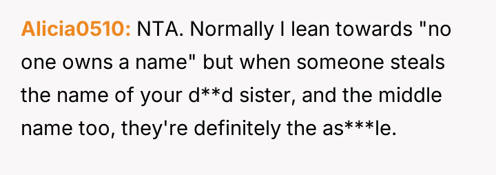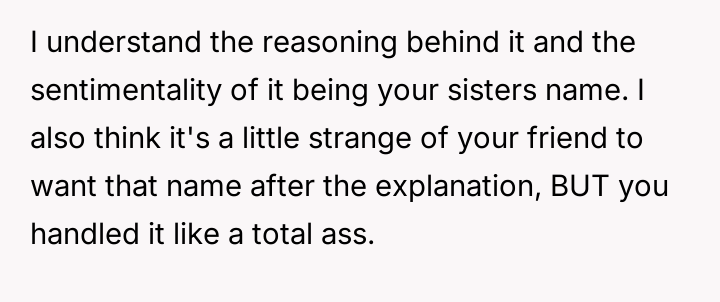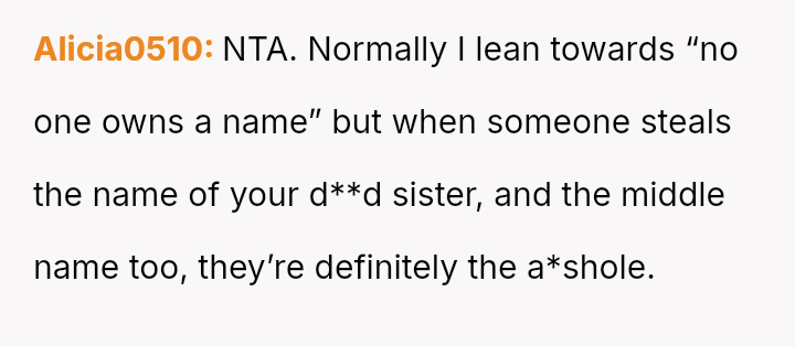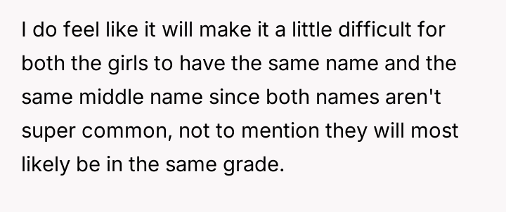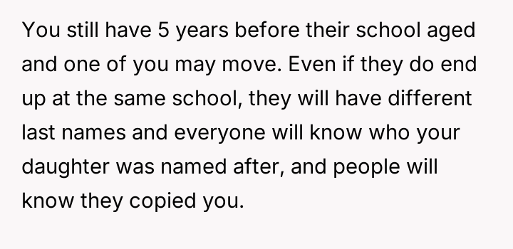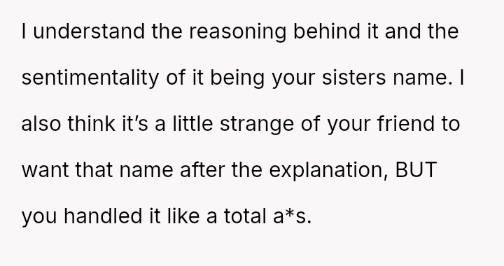 The original poster (OP) is deeply conflicted, feeling justified in protecting the deeply personal meaning behind their chosen name, which honors a lost sister, but is also concerned about the practical complications of having two children with identical first and middle names attending the same school system as the friend's child.