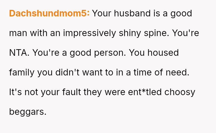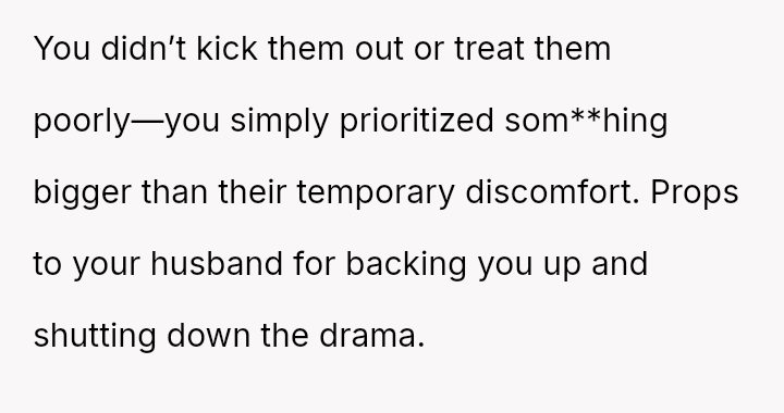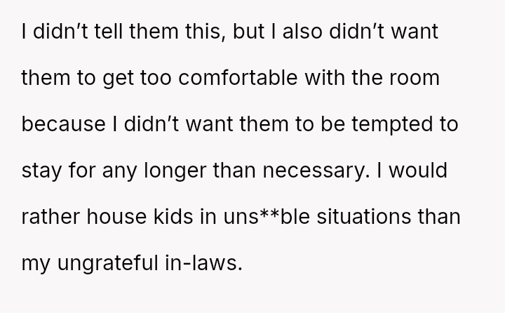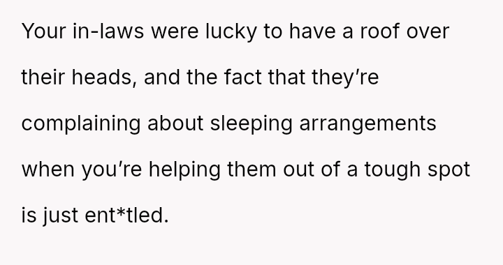 While the in-laws felt slighted by the sleeping arrangements, the OP and her husband maintained their boundaries regarding the use and preparation of their guest room.