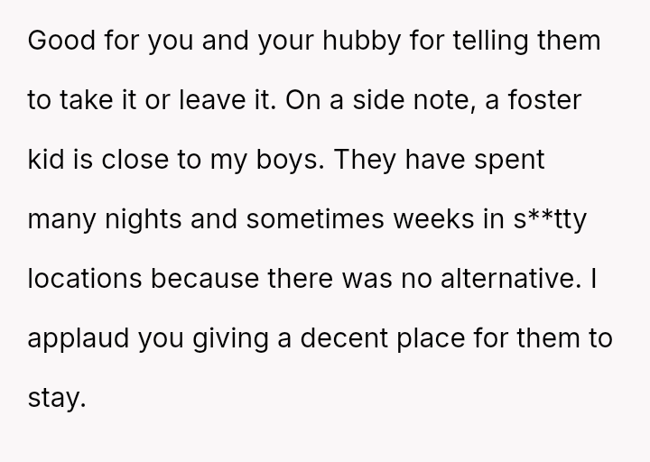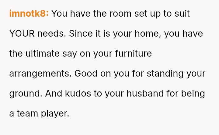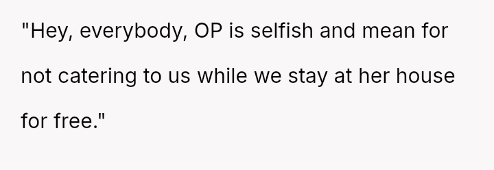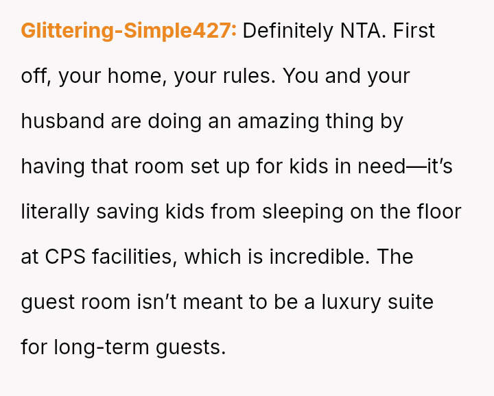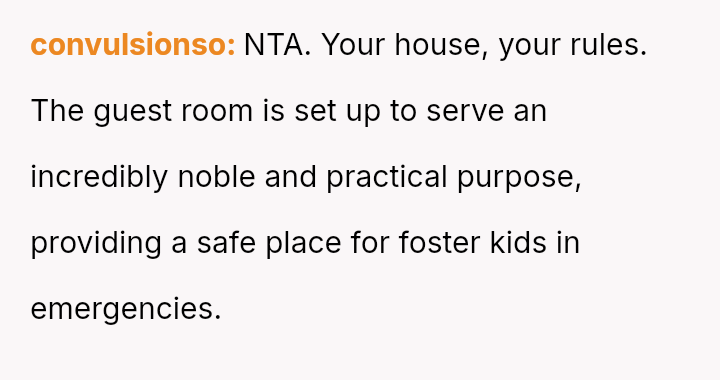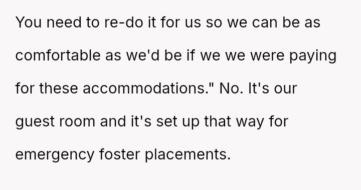The conflict stems from a clash between the in-laws' expectation of traditional guest comfort and the OP's es**blished priority for her home setup, which is designed to accommodate her demanding career supporting children in the state's overwhelmed foster care system.