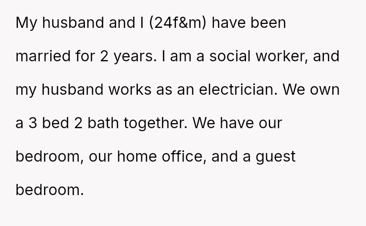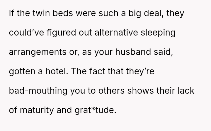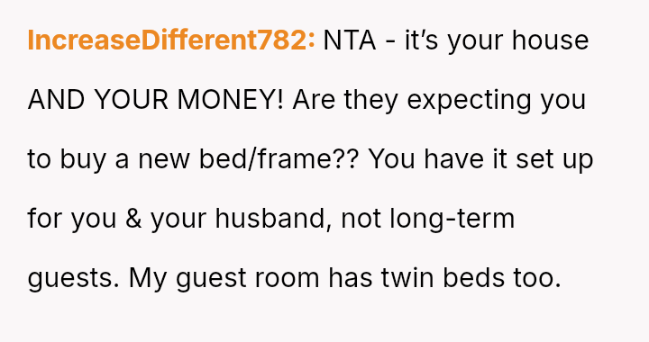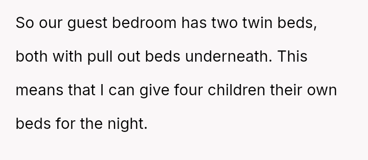 The OP and her husband own a three-bedroom home, with the guest room specifically set up to house multiple foster children in emergencies, featuring two separate twin beds. This setup was a point of contention for the visiting in-laws.