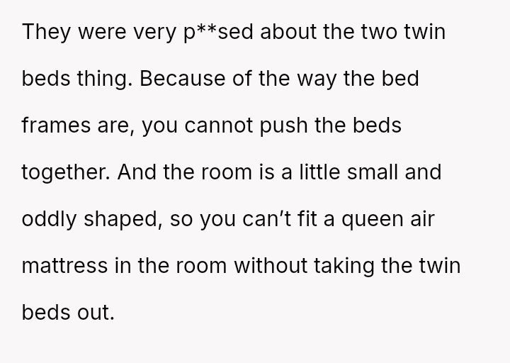 The in-laws strongly objected to sleeping in separate twin beds, insisting that the OP remove the existing furniture or place it in storage so they could use a queen-sized air mattress instead.