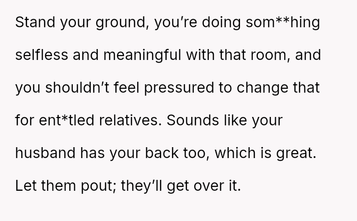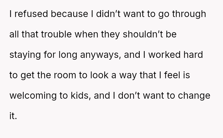 The OP refused to alter the room's setup, which she preferred to keep ready for foster children, leading to significant conflict.