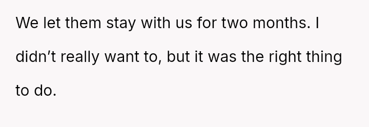 The original poster (OP), a social worker, and her husband offered their home to her husband's brother and sister-in-law for two months after the couple became temporarily homeless due to job loss.