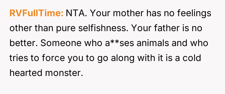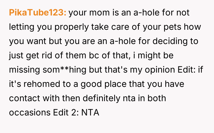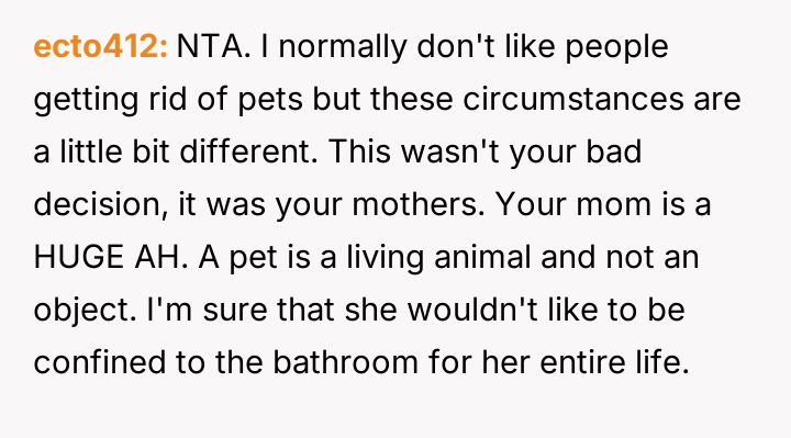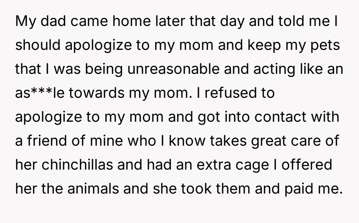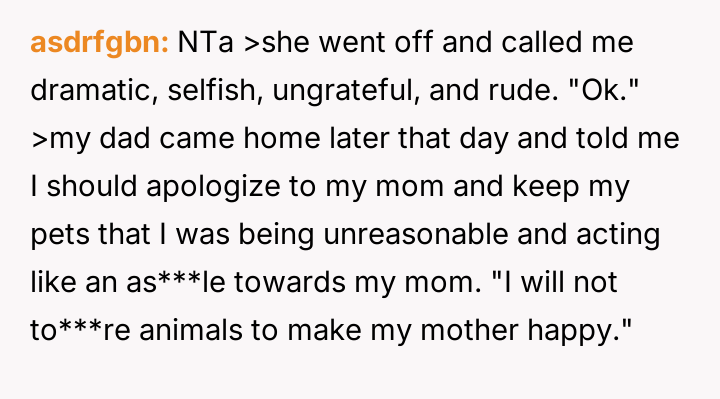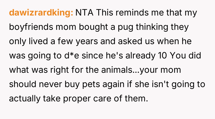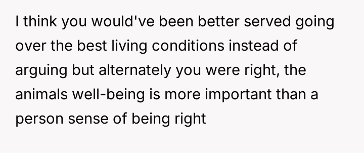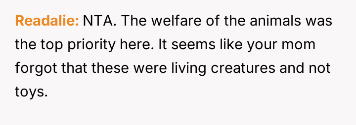 The core debate is whether prioritizing the well-being of the animals, based on extensive research, justifies defying a parent's directive, or if maintaining familial respect and obed*ence by keeping the pets despite inadequate housing was the expected behavior.