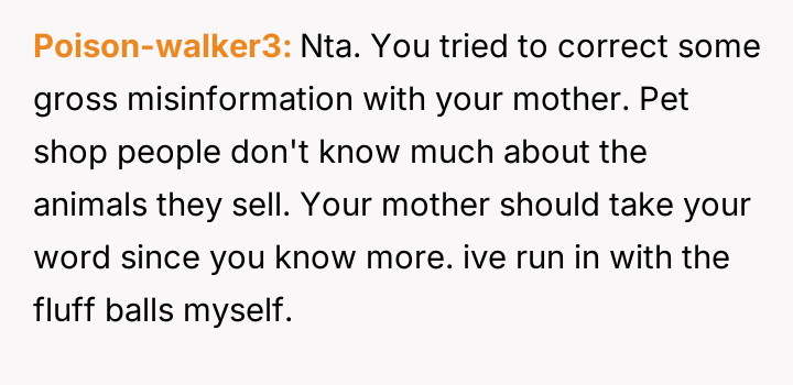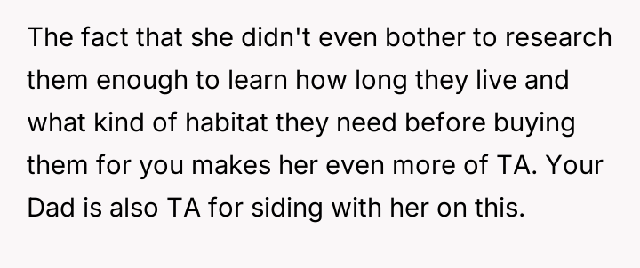 The original poster (OP) felt strongly committed to being a responsible pet owner, which conflicted directly with her mother's refusal to allow the necessary steps for proper animal care, including purchasing an appropriate habitat.