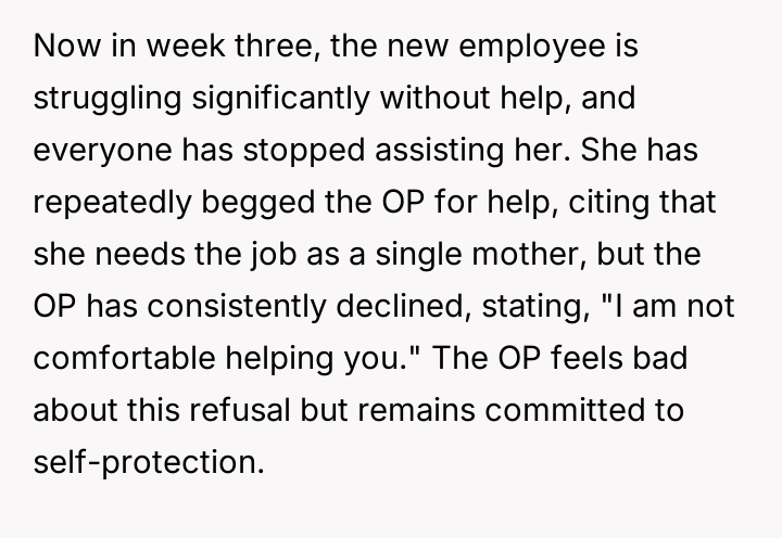 The central conflict lies between the OP's desire for self-preservation and the internal conflict arising from abandoning a mentoring role, especially given the new employee's stated vulnerability as a single mother.