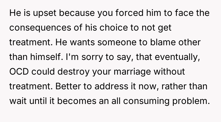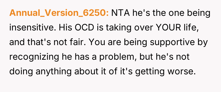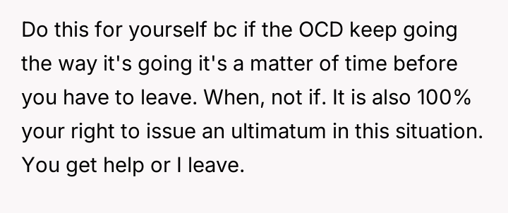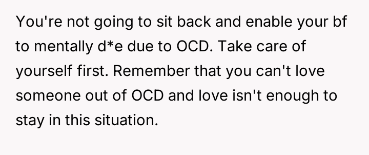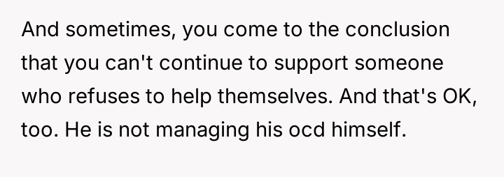 The original poster feels conflicted, wanting to be supportive of their partner's mental health struggle while also prioritizing important career obligations that are being jeopardized by the partner's refusal to seek treatment for their worsening OCD.