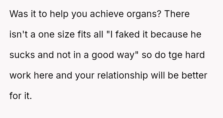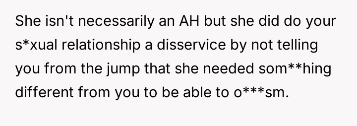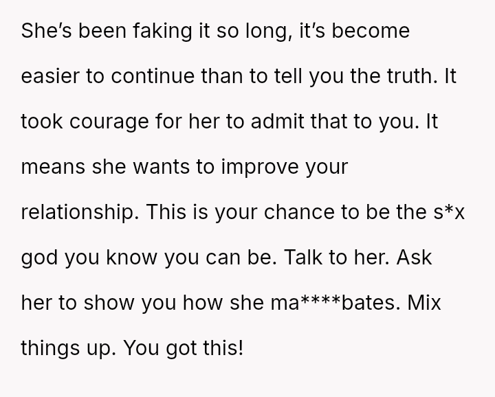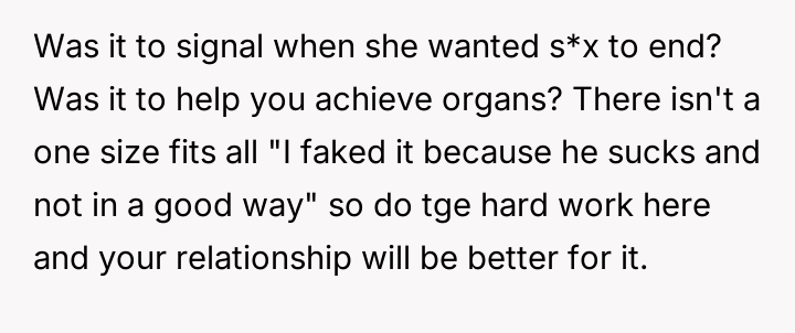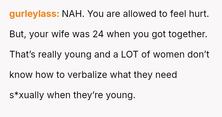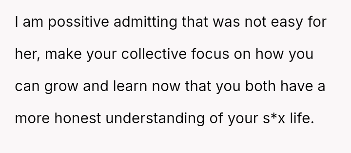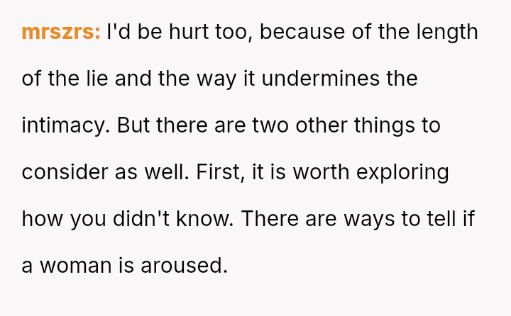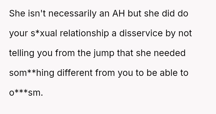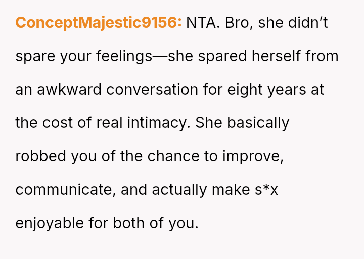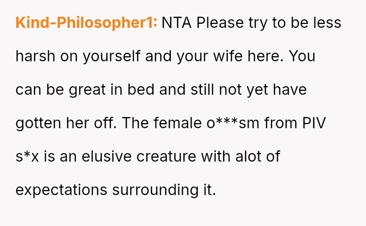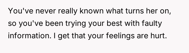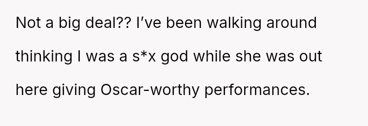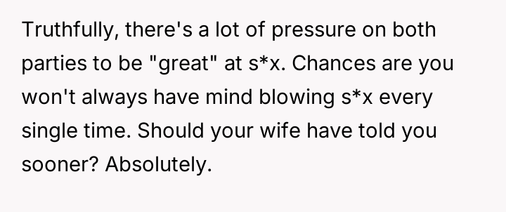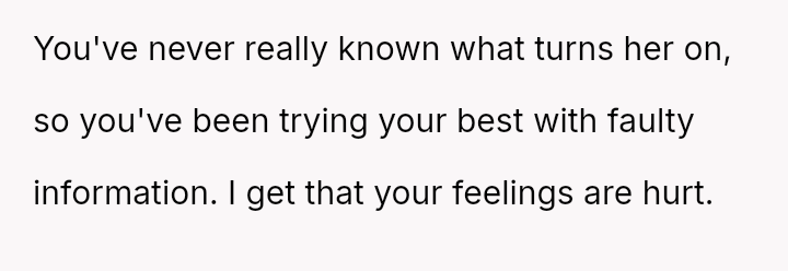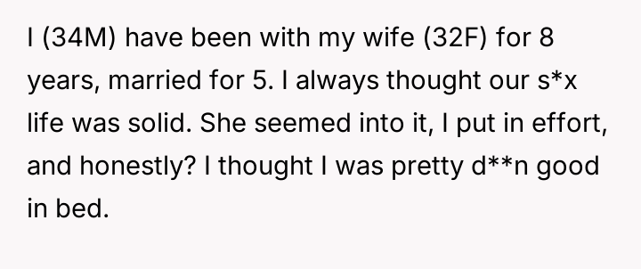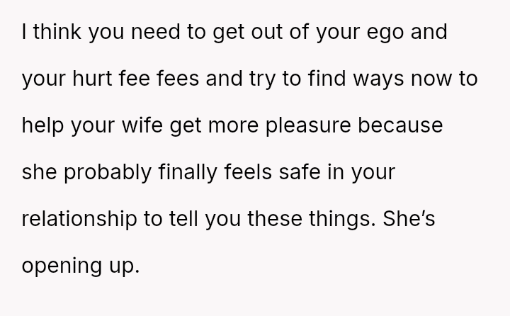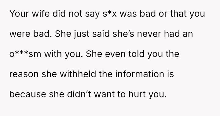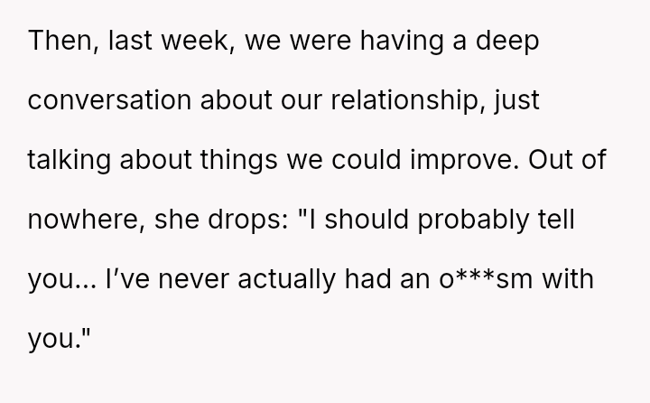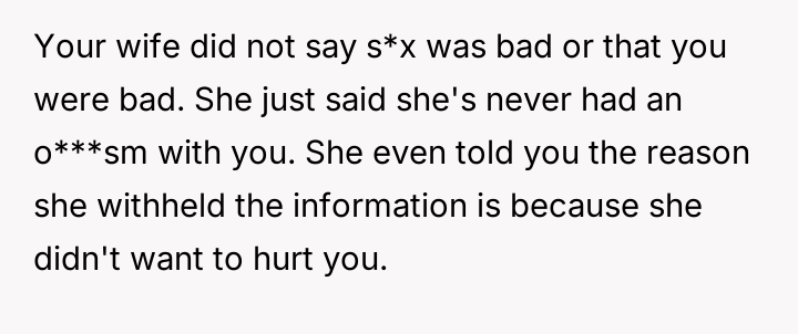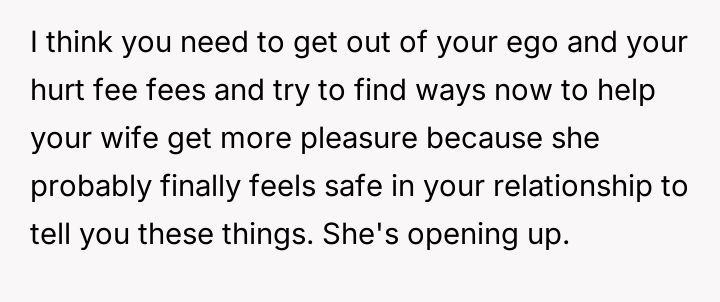 His conflict stems from his belief that he was a good s*xual partner being sharply contrasted with his wife's actions, where her desire to protect his ego prevented open communication about a critical aspect of their intimacy.