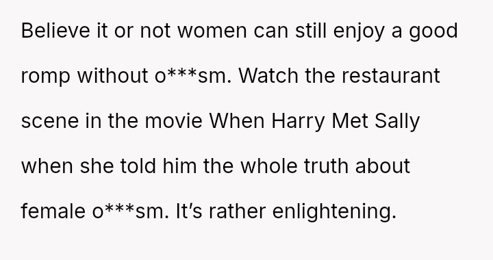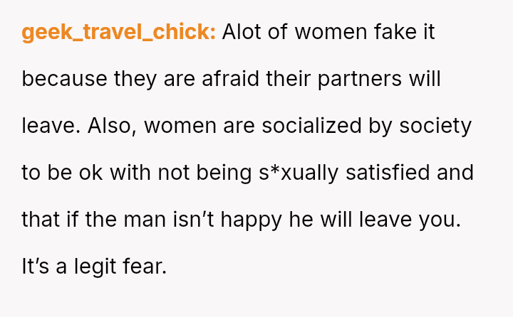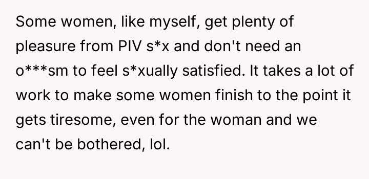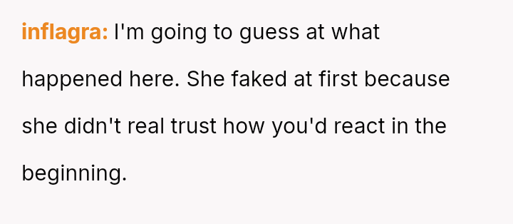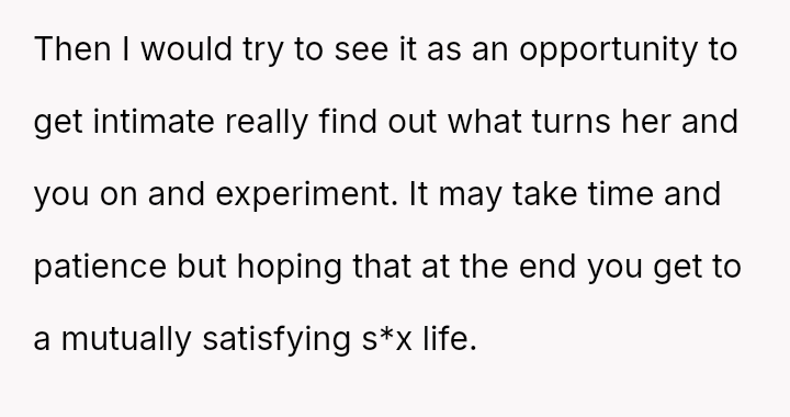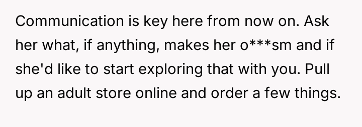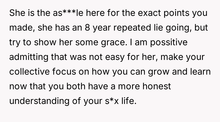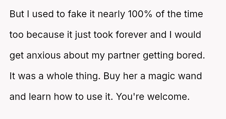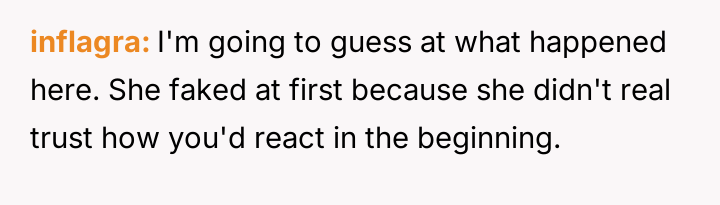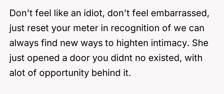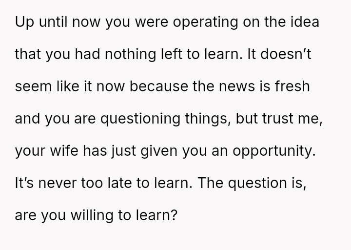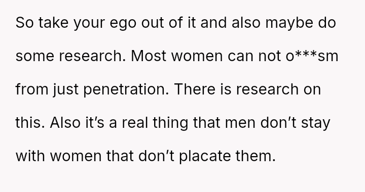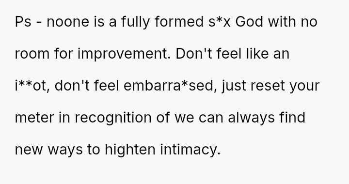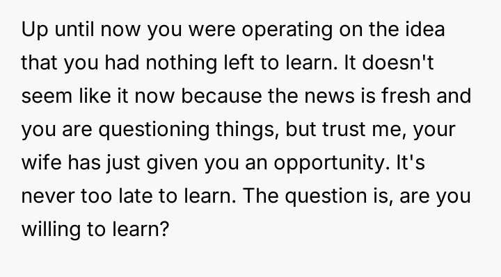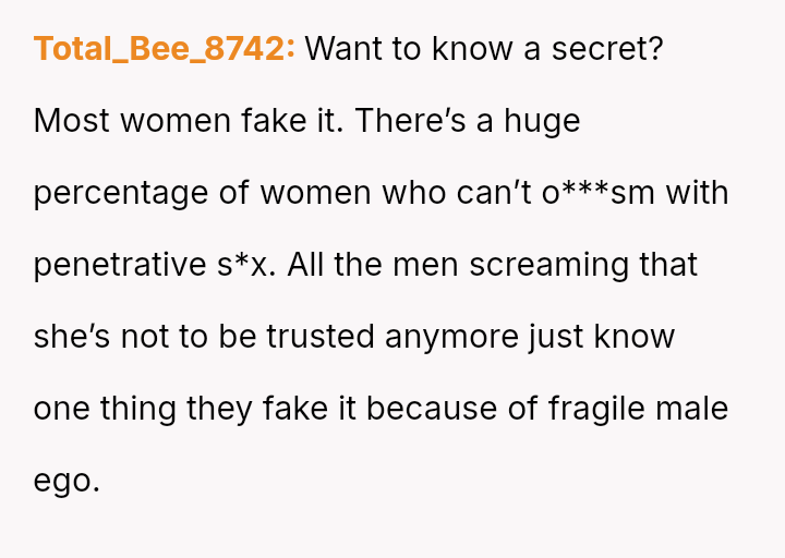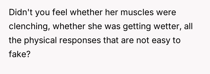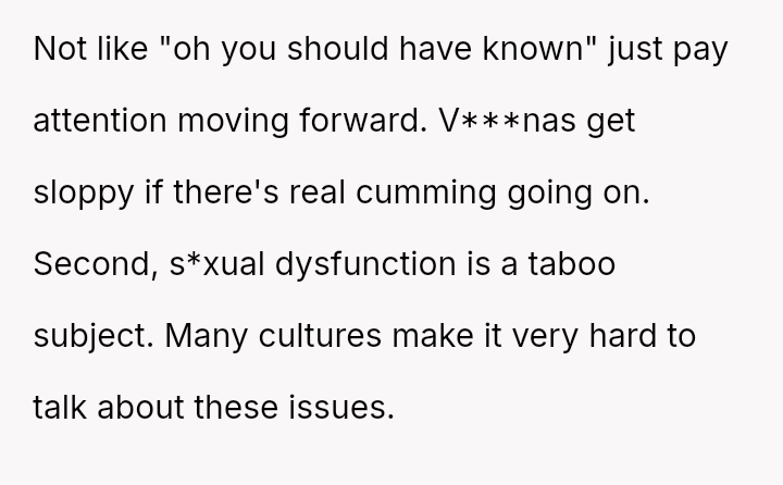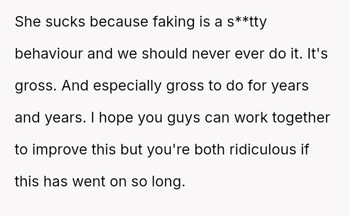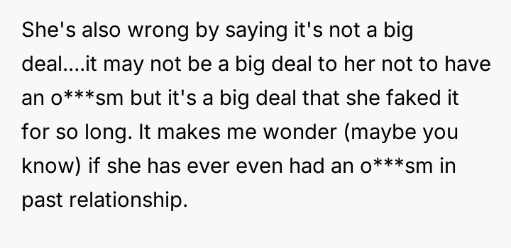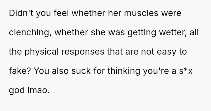 His conflict stems from his belief that he was a good s*xual partner being sharply contrasted with his wife's actions, where her desire to protect his ego prevented open communication about a critical aspect of their intimacy.