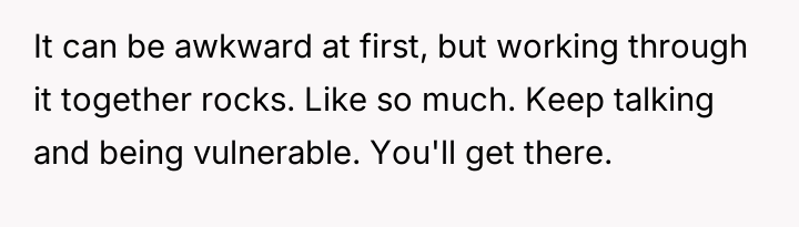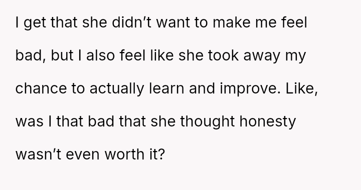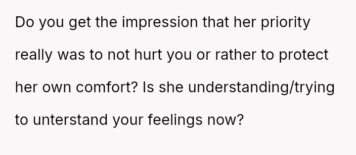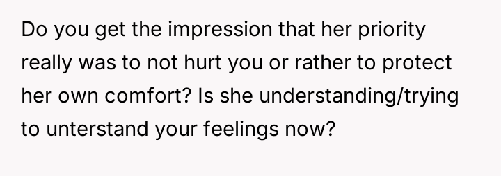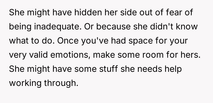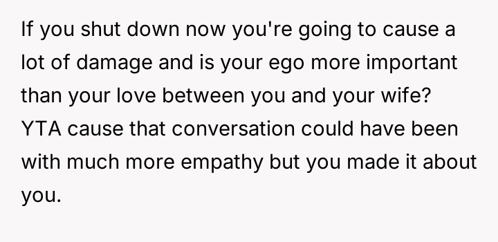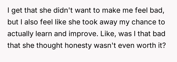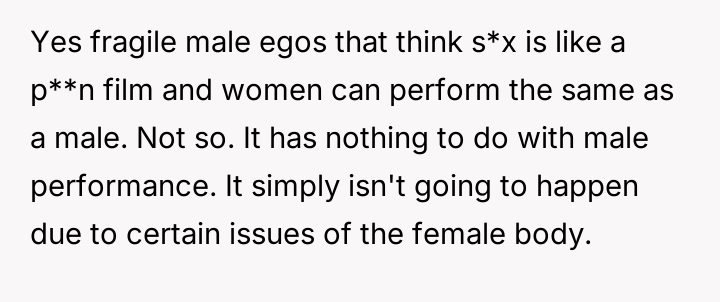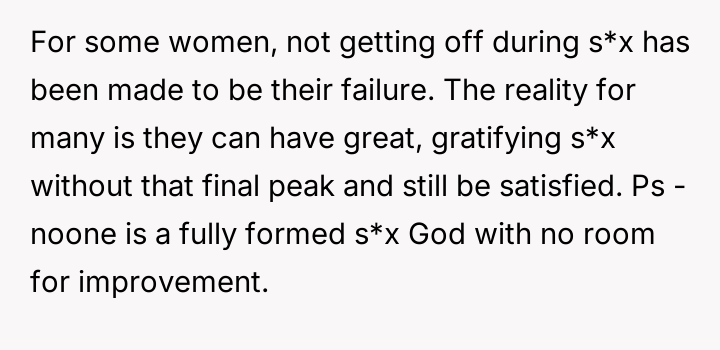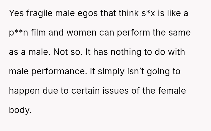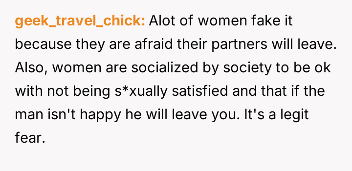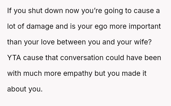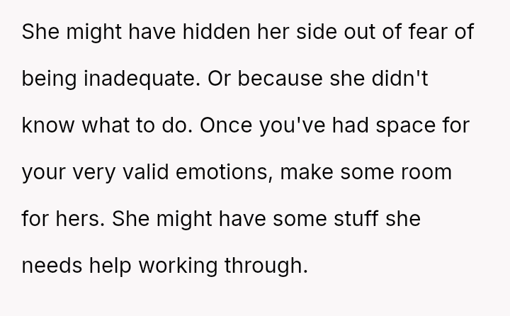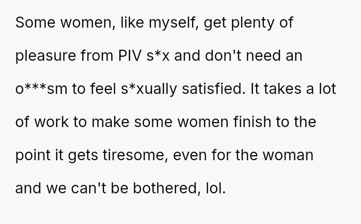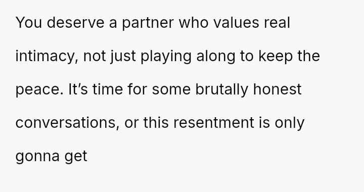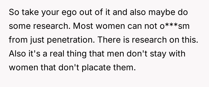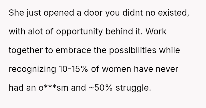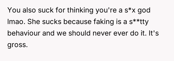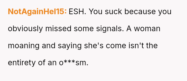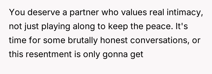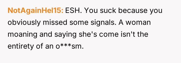 His conflict stems from his belief that he was a good s*xual partner being sharply contrasted with his wife's actions, where her desire to protect his ego prevented open communication about a critical aspect of their intimacy.