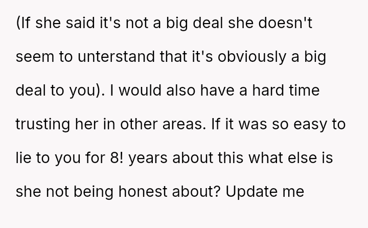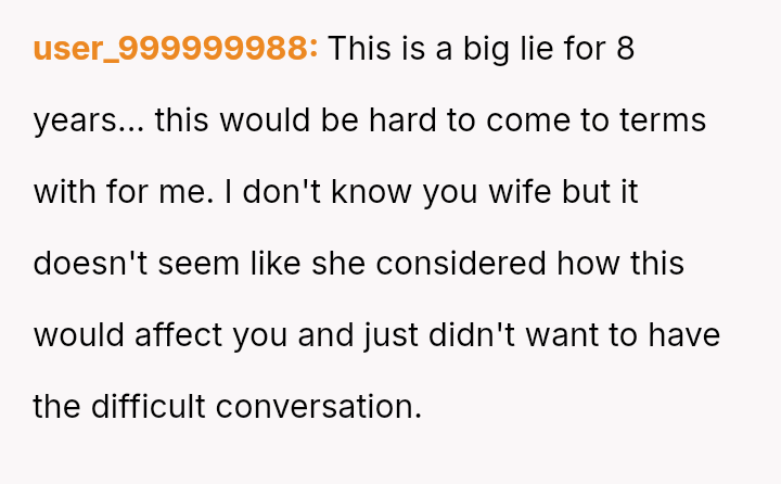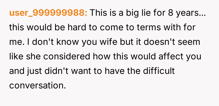 Is the husband overreacting to a situation his wife claims was motivated by kindness and a desire to avoid hurting his feelings, or was the suppression of this crucial information for eight years an act of dishonesty that fundamentally undermined the trust and potential for genuine intimacy in their marriage?