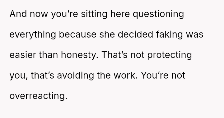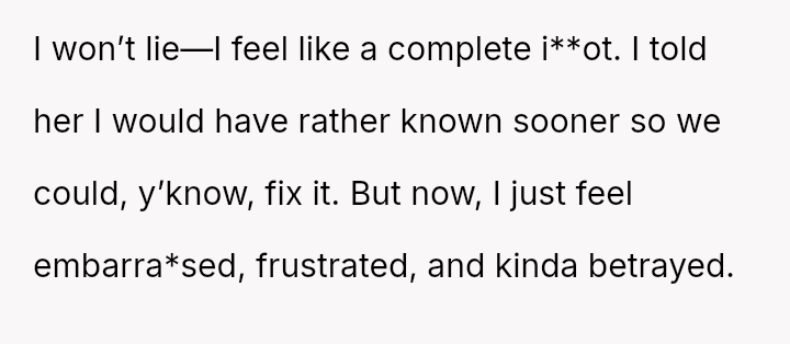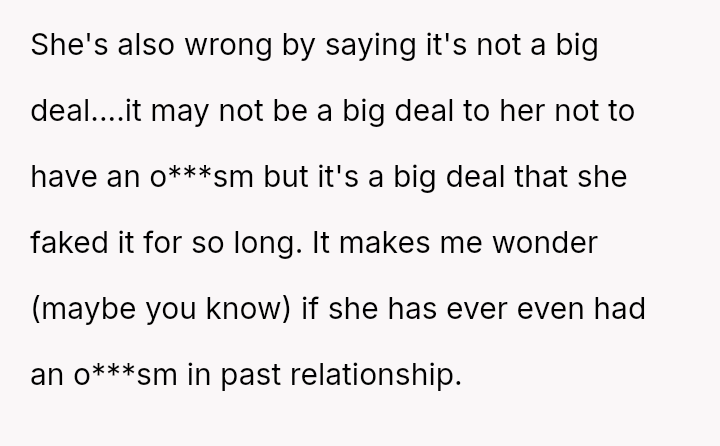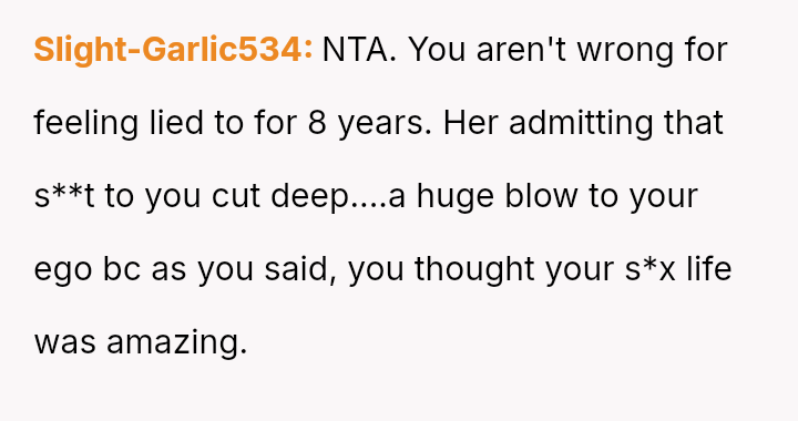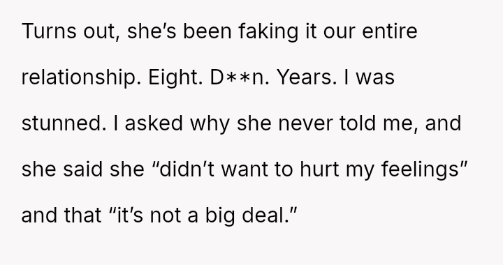 The original poster (OP) is experiencing significant distress, feeling foolish, embarra*sed, and betrayed after learning his wife has been faking o***sms for their entire eight-year relationship.